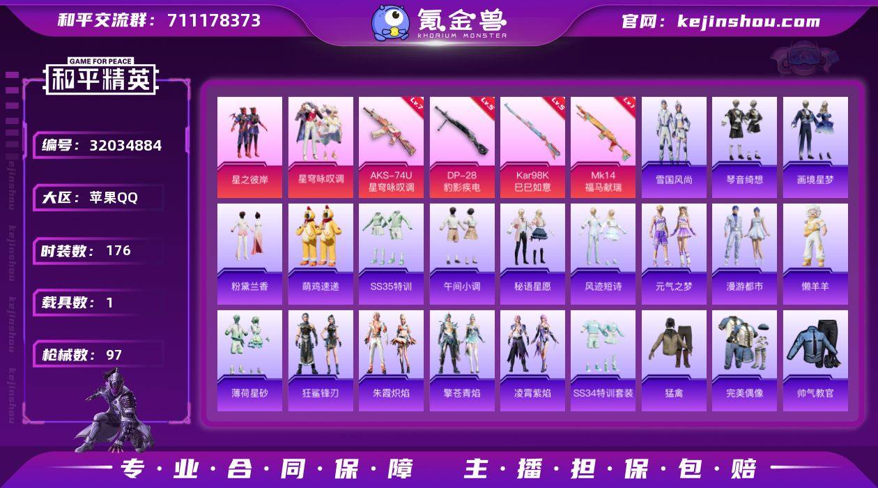 实名: 可修改 时装数: 176 载具数: 1 枪械数: 97 战备数: 1 热门装扮: 星之彼岸,星穹咏叹调 稀有枪皮: Kar98K-巳巳如意,AKS-74U-星穹咏叹调,DP-28-豹影疾电,MK14-福马献瑞 亮点: 【优质装备】:七级AKS-74U-星穹咏叹调