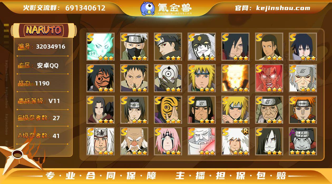 【编号23364可秒换绑】店长推荐特价处理精品号27S级忍者数-41A级忍者数 【S级忍者】:猿飞日斩「秽土转生」(3星),波风水门「秽土转生」(3星),千手扉间「秽土转生」(3星),千手柱间「秽土转生」(3星),宇智波鼬「秽土转生」(3星),宇智波斑「秽土转生·解」(3星),大野木「忍界大战」(3星),春野樱「忍界大战」(3星),宇智波带土「忍界大战」(3星),宇智波鼬「须佐能乎」(3星),宇智波止水「须佐能乎」(3星),旗木卡卡西「须佐能乎」(3星),千手柱间「木叶创立」(3星),自来也(3星),自来也「舞之豪杰」(3星),大蛇丸(3星),波风水门(3星),神秘面具男(3星),神秘面具男「红夜之刃」(3星),漩涡鸣人「九喇嘛连结」(3星),迈特凯「死门」(3星),佩恩「天道」(3星),宇智波佐助「永恒万花筒」(3星),宇智波斑 「白面具」(3星宇智波斑「白面具」),大筒木金式(3星),大筒木桃式(3星),大筒木舍人「最终章」(3星) 【A级忍者】:艾「青年」(2星),长门「青年」(2星),波风水门「青年」(2星),波风水门「新春限定」(2星),达鲁伊「博人传」(2星),迪达拉(2星),大蛇丸「晓」(2星),飞段(2星),飞段「死司凭血」(2星),干柿鬼鲛(5星),漩涡博人「桃式显现」(2星),漩涡鸣人「九尾查克拉」(2星),迈特凯(5星),旗木卡卡西「幻之真容」(2星),桃地再不斩「漂泊武士」(2星),我爱罗「疾风传」(4星),我爱罗「忍界大战」(2星),蝎(4星),角都「秽土转生」(2星),猿飞阿斯玛(5星),宇智波止水(2星),宇智波止水「新春限定」(2星),宇智波鼬(2星),宇智波佐助「须佐能乎」(2星),宇智波佐助「万花筒写轮眼」(2星),照美冥「五代目水影」(2星),日向宁次「忍界大战」(2星),日向雏田「最终章」(2星),宇智波带土「暴怒」(2星),长十郎「六代目水影」(2星),卑留呼「火之意志继承者」(2星),神秘面具男「忍者之路」(2星),李洛克...
