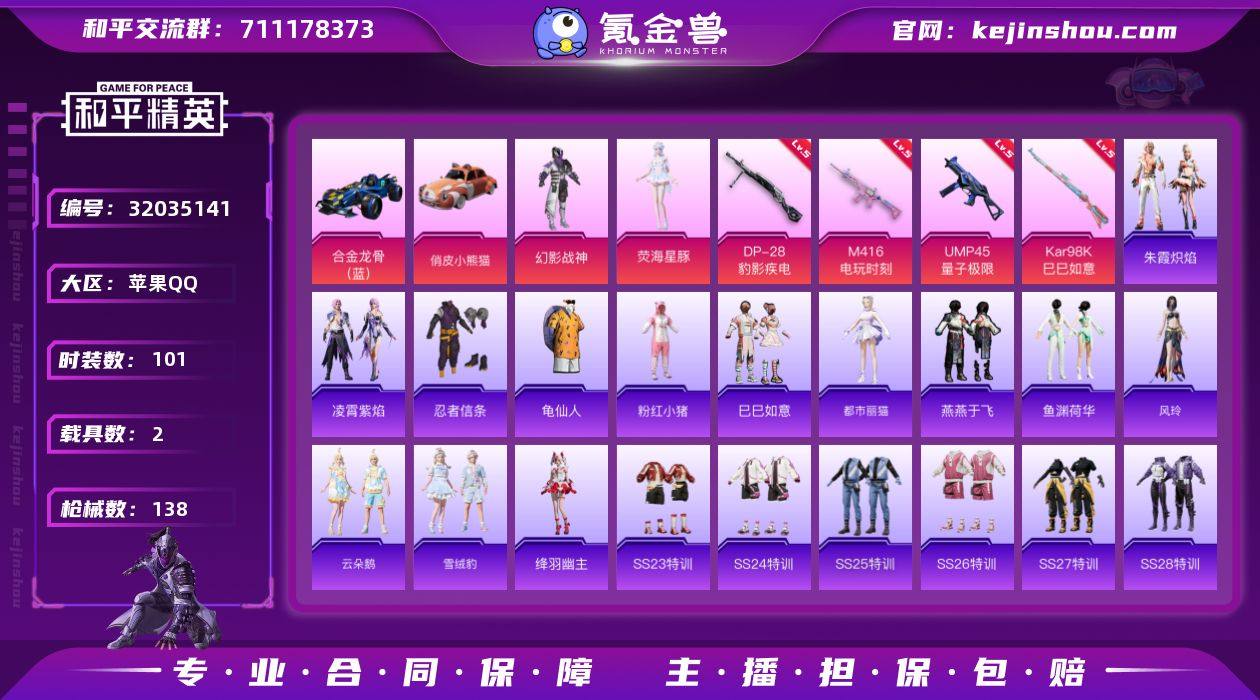 无二次-苹果 手Q-2粉装-6特效枪-2载具-0粉色飞行器-38450热力值-4王牌印记-101套装-138枪皮HZ263109 【热门品类】:套装-忍者信条,套装-龟仙人,套装-粉红小猪 【粉色套装】:粉装-幻影战神,角色-荧海星豚 【粉色枪皮等级】:M416-电玩时刻(五级),ACE32-萌骑漫游(五级),UMP45-量子极限(五级),Kar98K-巳巳如意(五级),Mk14-福马献瑞(五级),DP-28-豹影疾电(五级) 【粉色载具】:合金龙骨(蓝),俏皮小熊猫 【粉色枪皮】:M416-电玩时刻,ACE32-萌骑漫游,UMP45-量子极限,Kar98K-巳巳如意,Mk14-福马献瑞,DP-28-豹影疾电 【粉色降落伞】:快乐主宰降落伞,幻影战神降落伞,闪光银龙降落伞,电糖天使降落伞,创世·救赎降落伞,魔法神域降落伞,鬼刀降落伞,星穹咏叹调降落伞,绯穹魔姬降落伞 【稀有套装】:套装-龟仙人,套装-巳巳如意,角色-魂电,套装-马上来财,角色-都市丽猫,套装-燕燕于飞,套装-鱼渊荷华,角色-风玲,套装-云朵鹅,套装-雪绒豹,角色-绛羽幽主,套装-朱霞炽焰,套装-凌霄紫焰,套装-雨过天青,套装-红釉青花 【稀有枪皮】:AKM-彩虹符号,AKM-破晓战魂,AKM-缤纷海域,AKM-龙的传人,M16A4-幻世战舞者,SCAR-L-夜灯,SCAR-L-炫彩节奏,SCAR-L-玉兔迎春,M416-糯团青竹,M416-红色方程式,M416-绯红前夜,GROZA-彩虹符号,GROZA-懵萌河马,GROZA-荧海星豚,AUG-天降萌叽,AUG-幻影战神,AUG-耀粉歌者,QBZ-彩虹符号,M762-天降萌叽,M762-快乐主宰,M762-云朵鹅,G36C-懵萌河马,AC-VAL-天降萌叽,AC-VAL-闲梦青缨,蜜獾-天降萌叽,ARX-凌霄紫焰,UZI-啾咪啾咪,UZI-天降萌叽,UZI-幻影战神,UZI-影袭,UZI-炫彩节奏,UZI-红色方程式,UMP45-蓝色火焰,Vector-创世·救赎,汤姆逊-天降萌叽,汤姆逊-幻影战神,汤姆逊-炫彩节奏,JS9-凌霄紫焰,P90-巳巳如意,SKS-迅猛狂鲨,VSS-彩虹符号...