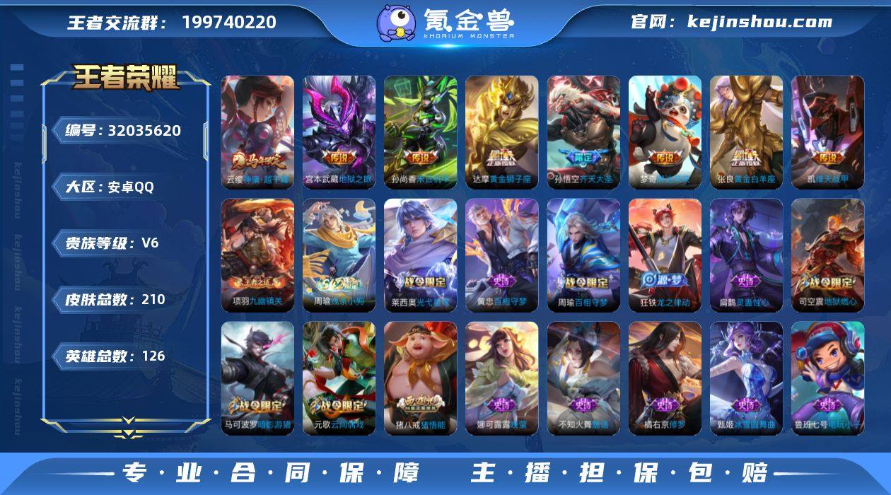 安卓Q-V6-最强王者段位-126英雄-210皮肤-8传说-51史诗 【英雄全皮】:孙权全皮 【传说皮肤】:云缨神骥越千峰,孙悟空齐天大圣,铠绛天战甲,张良黄金白羊座,达摩黄金狮子座,梦奇胖达荣荣,孙尚香末日机甲,宫本武藏地狱之眼 【限定皮肤】:白起狰,姜子牙天穹之誓,狄仁杰阴阳师,赵云皇家上将,孙尚香蔷薇恋人,高渐离玩趣恶龙,钟无艳王者之锤,扁鹊炼金王,芈月重明,元歌云间偶戏,元歌无心,夏侯惇朔风刀,曹操烛龙,典韦穷奇,马可波罗暗影游猎,狄仁杰魔术师,狄仁杰万华元夜,达摩沙漠行僧,项羽海滩派对,老夫子醍醐杖,程咬金演武夺筹,兰陵王金庭之子,亚瑟潮玩骑士王,孙悟空齐天大圣,牛魔御旌,李元芳云中旅人,钟馗驱傩正仪,蔡文姬繁星吟游,太乙真人饕餮,鬼谷子原初探秘者,鬼谷子五谷丰年,苏烈千军破阵,百里玄策原初追逐者,弈星混沌棋,明世隐疑决卦,裴擒虎李小龙,裴擒虎擒涛扼浪,狂铁御狮,米莱狄御霄,云中君纤云弄巧,盾山御銮,猪八戒西部大镖客,猪八戒猪悟能,上官婉儿梁祝,鲁班大师探海日志,桑启海盐诗旅,司空震地狱燃心,张良古海寻踪,蒙恬荣光圣徽,鬼谷子天穹祈灯,沈梦溪龙舞盛年,程咬金群星魔术团,镜青焰无极 【赛季限定】:扁鹊炼金王,白起狰,太乙真人饕餮,曹操烛龙,芈月重明,典韦穷奇,狂铁御狮,米莱狄御霄,牛魔御旌,盾山御銮,夏侯惇朔风刀,弈星混沌棋,明世隐疑决卦,老夫子醍醐杖,鬼谷子原初探秘者,狄仁杰万华元夜,程咬金演武夺筹,钟馗驱傩正仪,苏烈千军破阵,达摩沙漠行僧,兰陵王金庭之子,李元芳云中旅人,桑启海盐诗旅,裴擒虎擒涛扼浪,鲁班大师探海日志,张良古海寻踪,鬼谷子天穹祈灯,姜子牙天穹之誓,太乙真人谧流熔炉,甄姬逆浪荇歌,亚瑟荣光之誓,百里玄策原初追逐者,蒙恬荣光圣徽,项羽九幽镇关 【战令限定】:马可波罗暗影游猎...