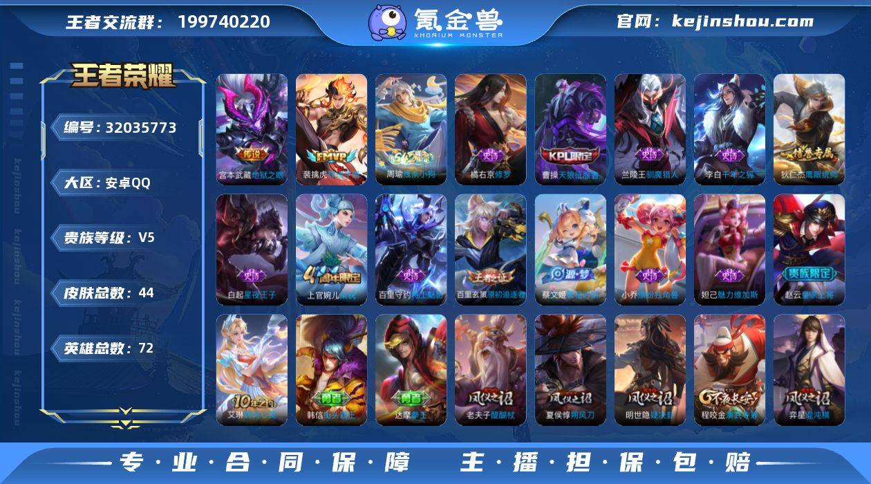 贵族等级:V5 典藏皮肤数:0 珍品无双皮肤数:0 无双皮肤数:0 珍品传说皮肤数:0 传说皮肤数:2 史诗皮肤数:13 皮肤数:44 英雄数:72 段位:王者 卖家说:1.2李白 1.2韩信1.1关羽 巅峰小魔方