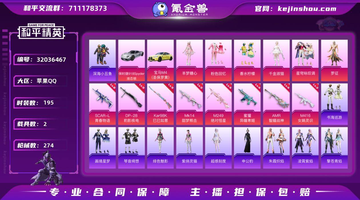 苹果 手Q-6粉装-11特效枪-2载具-3粉色飞行器-89502热力值-13王牌印记-195套装-274枪皮 【热门品类】:套装-深海小丑鱼,套装-小丑鱼,角色-军刀雅典娜,套装-龟仙人,套装-粉红小猪 【粉色套装】:粉装-粉色回忆,粉装-香水柠檬,角色-千金淑猫,粉装-星穹咏叹调,角色-罗征,角色-羊梦糖心 【粉色枪皮等级】:SCAR-L-青春物语(六级),M416-女娲灵识(三级),蜜獾-异瞳寒姬(四级),ACE32-萌骑漫游(五级),AKS-74U-森灵之息(五级),Kar98K-巳巳如意(五级),Mk14-甜梦熊击(五级),Mk14-福马献瑞(四级),AMR-智耀战神(四级),M249-绝对恒星(四级),DP-28-豹影疾电(五级) 【粉色载具】:宝马M4(圣保罗黄),保时捷918 Spyder(液态银) 【粉色枪皮】:SCAR-L-青春物语,M416-女娲灵识,蜜獾-异瞳寒姬,ACE32-萌骑漫游,AKS-74U-森灵之息,Kar98K-巳巳如意,Mk14-甜梦熊击,Mk14-福马献瑞,AMR-智耀战神,M249-绝对恒星,DP-28-豹影疾电 【粉色飞行器】:炫彩糖果飞行器,飞天猪飞行器,极意拳锋飞行器 【粉色降落伞】:绝对恒星降落伞,梦幻火箭降落伞,香水柠檬降落伞,齐天大圣降落伞,海渊国主降落伞,幻梦音符降落伞,筑梦精灵降落伞,炙焰牛王降落伞,环太平洋降落伞,垂柳戏鸭降落伞,时空协奏降落伞,千金淑猫降落伞,雪月幻音降落伞,星穹咏叹调降落伞,辉羽雀灵降落伞,绯穹魔姬降落伞,奇迹舞步降落伞,异瞳寒姬降落伞,炫彩糖果降落伞 【稀有套装】:套装-龟仙人,套装-圣穹绘梦,套装-小鸟芋圆,角色-超感刻度,套装-雪国风尚,套装-炫彩糖果,套装-马上有钱,套装-雏菊兔兔,套装-萝兰蝴蝶,套装-小熊娃娃,套装-先驱飞行员,套装-糖糖葫芦,套装-青团波波,套装-棉花软糖,角色-俏兔智灵,套装-燕燕于飞,套装-鱼渊荷华,套装-晶灵使者,套装-晶辉守护,角色-蜜桃派对,套装-粉恋花,套装-紫幽梦,套装-...
