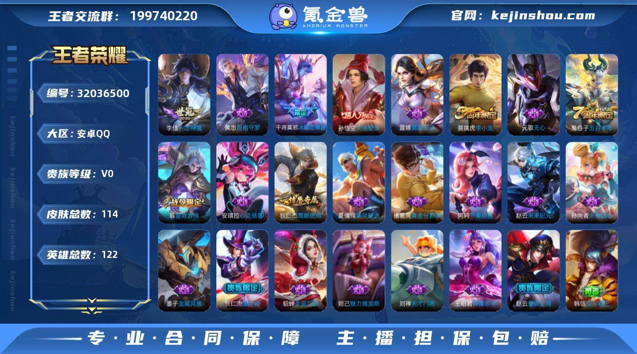 贵族等级:V0 典藏皮肤数:0 珍品无双皮肤数:0 无双皮肤数:0 珍品传说皮肤数:0 传说皮肤数:1 史诗皮肤数:22 皮肤数:114 英雄数:122 段位:铂金 卖家说:靠谱就玩啥?