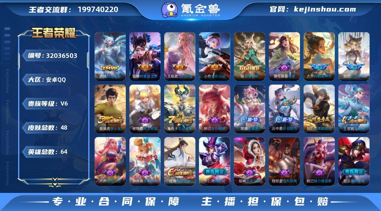 64英雄-48皮肤-便宜女号 v6//4传说/20史诗/5稀有英雄【4 传说皮肤】游龙清影 西施,仲夏夜之梦 貂蝉,乞巧织情 王昭君,音你心动 小乔,【20 史诗皮肤】时之奇旅 安琪拉,高山流水 庄周,白鹤梁神女 大乔,猫狗日记 大乔,五谷丰年 鬼谷子,拒霜思 嫦娥,魅力维加斯 妲己,女仆咖啡 妲己,晚萤 娜可露露,遇见神鹿 瑶,鹰眼统帅 狄仁杰,李小龙 裴擒虎,纤云弄巧 云中君,时之彼端 妲己,魔术师 狄仁杰,皇家上将 赵云,功夫厨神 程咬金,梁祝 上官婉儿,圣诞恋歌 貂蝉,水果甜心 孙尚香,【15 勇者皮肤】爱心护理 阿轲,归虚梦演 孙膑,阴阳师 狄仁杰,海滩派对 项羽,万华元夜 狄仁杰,哥特玫瑰 露娜,瓷语鉴心 露娜,原初探秘者 鬼谷子,玩偶对对碰 安琪拉,千军破阵 苏烈,云中旅人 李元芳,紫罗兰之誓 妲己,神迹守卫 墨子,少女阿狸 妲己,驱傩正仪 钟馗, 【9 其他皮肤】龙域领主 铠,万圣前夜 小乔,木偶奇遇记 鲁班七号,花间舞 公孙离,归虚梦演 西施,幸存者 马超,蔷薇王座 蔡文姬,森 瑶,精灵公主 王昭君, 【5 稀有英雄】不知火舞,橘右京,夏洛特,娜可露露,韩信, 营地ID: