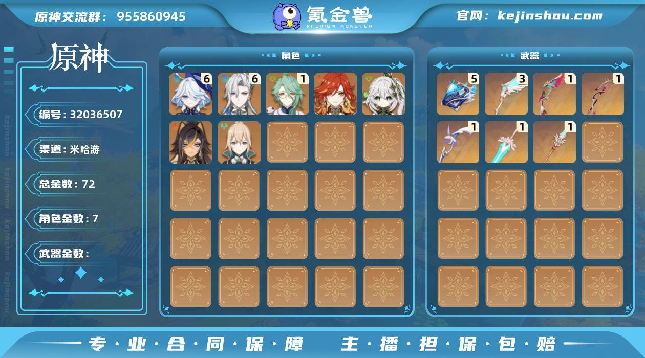 冒险等级:60 总黄数:116 5星角色数:44 5星武器数:35 原石数量:335 纠缠之源数量:7 6命基尼奇,6命刻晴,5命莫娜,4命迪卢克,4命七七,2命梦见月瑞希,2命恰斯卡,2命迪希雅,1命瓦雷莎,1命玛薇卡,1命那维莱特,1命八重神子,1命魈,1命申鹤,0命兹白,0命菲林斯,0命伊涅芙,0命茜特菈莉,0命希诺宁,0命克洛琳德,0命闲云,0命芙宁娜,0命莱欧斯利,0命林尼,0命白术,0命艾尔海森,0命流浪者,0命纳西妲,0命妮露,0命赛诺,0命夜兰,0命神里绫人,0命荒泷一斗,0命珊瑚宫心海,0命雷电将军,0命宵宫,0命神里绫华,0命枫原万叶,0命胡桃,0命甘雨,0命钟离,0命温迪,0命提纳里,0命琴 6命班尼特,6命嘉明,6命久岐忍,6命卡齐娜,6命欧洛伦,6命绮良良,6命香菱,6命行秋,6命夏沃蕾,6命芭芭拉,6命北斗,6命重云,6命迪奥娜,6命多莉,6命珐露珊,6命菲谢尔,6命九条裟罗,6命坎蒂丝,6命柯莱,6命罗莎莉亚,6命莱依拉,6命诺艾尔,6命凝光,6命砂糖,6命托马,6命五郎,6命辛焱,6命烟绯,6命瑶瑶,6命云堇,6命早柚,5命凯亚,5命雷泽,4命琳妮特,4命伊安珊,4命伊法,4命鹿野院平藏,3命菲米尼,2命爱诺,2命赛索斯,2命夏洛蒂,1命安柏,1命卡维,1命米卡,0命蓝砚,0命丽莎 精1焚曜千阳,精1星鹫赤羽,精1岩峰巡歌,精1山王长牙,精1赤月之形,精1有乐御簾切,精1鹤鸣余音,精1静水流涌之辉,精1金流监督,精1万世流涌大典,精1最初的大魔术,精1裁叶萃光,精1千夜浮梦,精1圣显之钥,精1赤沙之杖,精1赤角石溃杵,精1雾切之回光,精1护摩之杖,精1和璞鸢,精1贯虹之槊,精1终末嗟叹之诗,精1苇海信标,精1猎人之径,精1狼的末路,精1天空之卷,精1天空之脊,精1天空之刃 100%侦察骑士,古恩希尔德的传承,帆影游风,极夜真梦,倩影游侠,岁夜欢哗,纱中幽兰,星与月之约,雨化竹身,叶隐芳名,致教会自由人 卖家说:诚心诚意卖号。米家有三个游戏号。号是连在一起的