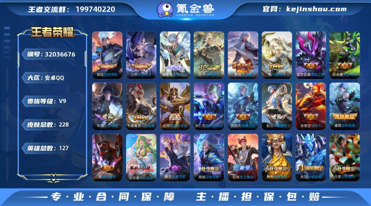 安卓Q-V9-最强王者段位-127英雄-228皮肤-2典藏皮肤-1典藏英雄-1无双-14传说-46史诗 【英雄全皮】:孙权全皮 【荣耀典藏】:武则天英雄,小乔天鹅之梦,韩信弑枪猎影 【无双皮肤】:诸葛亮天机白泽 【传说皮肤】:后羿神树通天,赵云淬星耀世,铠绛天战甲,镜炽阳神光,虞姬启明星使,李信一念神魔,干将莫邪久胜战神,后羿黄金射手座,李白凤求凰,孙尚香末日机甲,宫本武藏地狱之眼,孙悟空地狱火,武则天海洋之心,狄仁杰超时空战士 【限定皮肤】:白起狰,狄仁杰阴阳师,虞姬凯尔特女王,赵云皇家上将,嬴政白昼王子,孙尚香蔷薇恋人,鲁班七号狮舞东方,庄周高山流水,高渐离死亡摇滚,扁鹊炼金王,芈月重明,芈月白晶晶,吕布猎兽之王,元歌云间偶戏,夏侯惇朔风刀,甄姬游园惊梦,曹操烛龙,典韦穷奇,典韦蓝屏警告,狄仁杰魔术师,狄仁杰万华元夜,达摩沙漠行僧,项羽海滩派对,老夫子醍醐杖,关羽冰锋战神,程咬金演武夺筹,韩信逐梦之影,兰陵王金庭之子,牛魔御旌,李元芳云中旅人,虞姬启明星使,钟馗神迹守卫,钟馗驱傩正仪,杨玉环遇见飞天,女娲朔望之晖,雅典娜黎明之约,太乙真人饕餮,鬼谷子原初探秘者,大乔白鹤梁神女,苏烈千军破阵,百里玄策原初追逐者,弈星混沌棋,梦奇顽趣,沈梦溪大漠名商,明世隐疑决卦,裴擒虎擒涛扼浪,狂铁御狮,米莱狄御霄,盾山御銮,猪八戒猪悟能,上官婉儿梁祝,嫦娥拒霜思,西施玲珑珍味,鲁班大师探海日志,桑启海盐诗旅,刘邦剑破天穹,项羽苍威无极 【年限皮肤】:李白凤求凰 【赛季限定】:扁鹊炼金王,虞姬凯尔特女王,白起狰,太乙真人饕餮,曹操烛龙,芈月重明,典韦穷奇,狂铁御狮,米莱狄御霄,牛魔御旌,盾山御銮,夏侯惇朔风刀,弈星混沌棋,明世隐疑决卦,老夫子醍醐杖,鬼谷子原初探秘者,狄仁杰万华元夜,程咬金演武夺筹,钟馗驱傩正仪,苏烈千军...