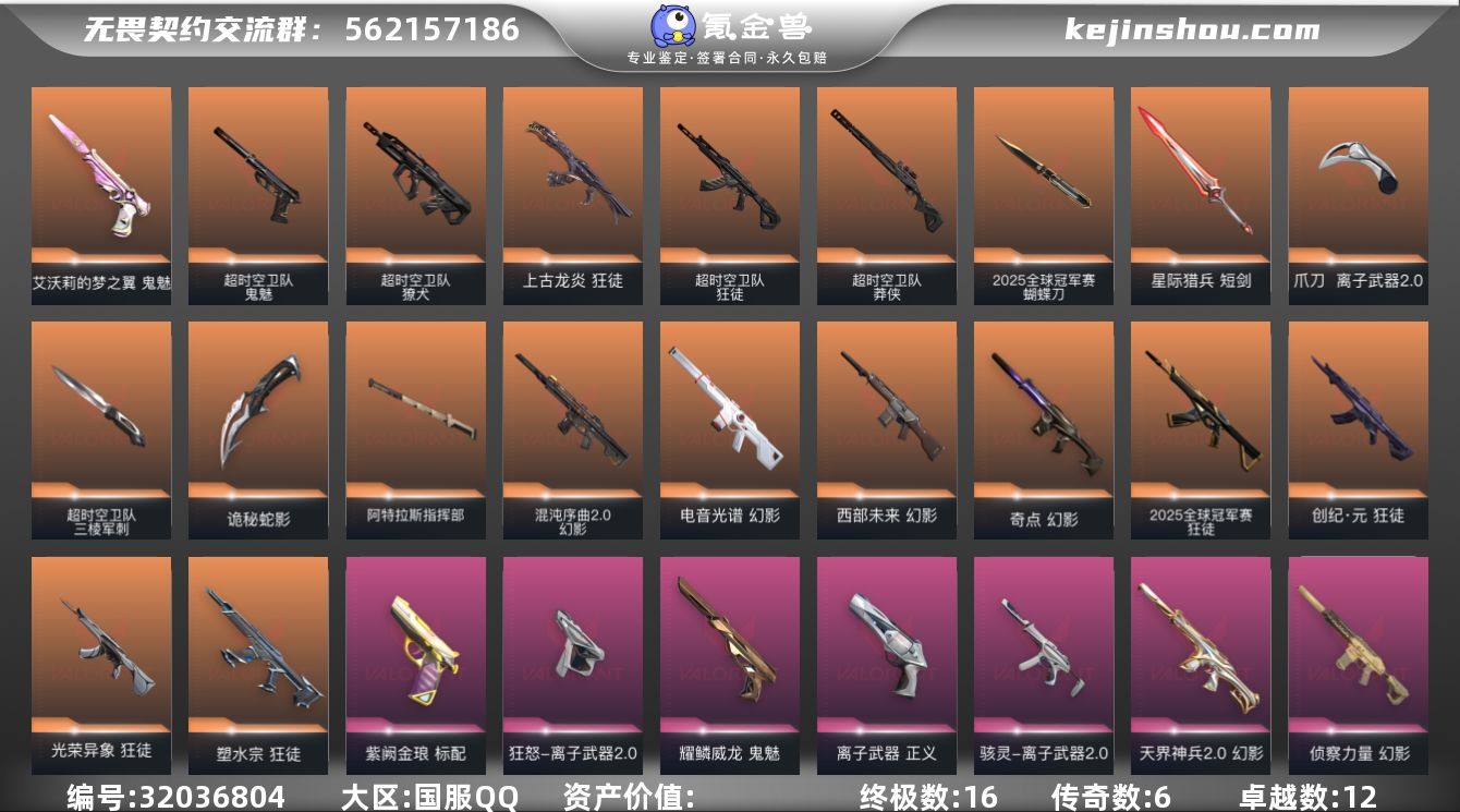 25冠军套紫金、塑水、盖亚、超多热门皮肤近战、枪皮 qyz9074 【近战武器】:近战武器-2025全球冠军赛 蝴蝶刀,近战武器-超时空卫队 三棱军刺,近战武器-剥皮小刀,近战武器-离子武器//2.0 爪刀,近战武器-诡秘蛇影 军刀,近战武器-阿特拉斯指挥部 甩棍,近战武器-星际猎兵 短剑 【狂徒】:狂徒-上古龙炎,狂徒-超时空卫队,狂徒-2025全球冠军赛,狂徒-塑水宗,狂徒-创·纪元,狂徒-光荣异象,狂徒-盖亚的复仇,狂徒-紫阙金琅,狂徒-离子武器//2.0,狂徒-诡秘蛇影 【幻影】:幻影-奇点,幻影-西部未来,幻影-电音光谱,幻影-混沌序曲//2.0,幻影-天界神兵//2.0,幻影-异形猎人,幻影-侦察力量,幻影-末日之翼,幻影-西部未来,幻影-电音光谱 【戍卫】:戍卫-折光棱晶 【獠犬】:獠犬-超时空卫队 【飞将】:飞将-末日之翼 【莽侠】:莽侠-超时空卫队,莽侠-诡秘蛇影 【战神】:战神-离子武器//2.0 【奥丁】:奥丁-末日之翼 【判官】:判官-诡秘蛇影 【骇灵】:骇灵-离子武器//2.0,骇灵-无限竞技 【蜂刺】:蜂刺-折光棱晶 【标配】:标配-紫阙金琅,标配-折光棱晶 【正义】:正义-离子武器 【鬼魅】:鬼魅-艾沃莉的梦之翼,鬼魅-超时空卫队,鬼魅-耀鳞威龙,鬼魅-诡秘蛇影 【狂怒】:狂怒-离子武器//2.0 【短炮】:短炮-末日之翼 【卡面】:Clutch 卡面,无畏契约GO!第一卷:芮娜 卡面,复古浪潮 卡面,无畏契约GO!第一卷:零 卡面,无垠星环 卡面,《双城之战》金克丝 卡面,钢锁vs盖可 卡面,代号红色 卡面,新兵报到 卡面,V契约 卡面,无畏契约 卡面 【喷漆】:买装还是存钱 喷漆,胜利属于无畏契约 喷漆,GLHF 喷漆,无畏契约 喷漆 【挂饰】:瓶中信 挂饰,天外飞客 挂饰,无畏契约 纪念币 挂饰