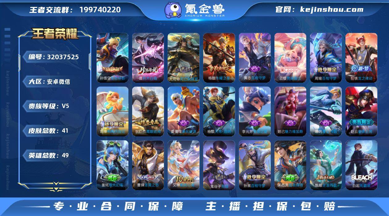 实名: 可修改 性别: 男号 贵族等级: V5 英雄数: 49 皮肤数: 41 荣耀水晶: 全息碎影 珍品传说: 朽木白哉 传说皮: 死亡执政官 限定皮: 永曜之星 亮点: 【优质装备】:全息碎影(猴子典藏),朽木白哉