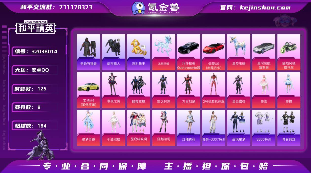 【和平精英】15粉装,11特效枪,7载具,历史最高段位:绝世王牌27星 王牌印记17次 热力值:119466,252套装,324枪械,463装备,218战备;套装:幽焰骑士-维塔,魔童闹海-哪吒,套装-梦幻火箭,套装-暗夜玫瑰,角色-2号机款机体服,角色-万古烈焰,角色-宙之时溯,角色-星云暗核,玩偶服-猪猪侠,角色-美雪,角色-美琪,角色-星梦奇缘,角色-千金淑猫,角色-狂魅哈莉,套装-星穹咏叹调,角色-奇迹舞步 美雪,角色-罪夜之冕,套装-特训学院,套装-猎鹰,套装-青年教官,套装-橘黑制服,套装-红色运动,套装-黄色运动,套装-蓝色运动,套装-黄色伏地魔,套装-白色伏地魔,套装-黑色伏地魔,套装-骑行爱好者,套装-竞技名士,套装-深蓝色名流,套装-酒红色名流,套装-湖蓝色名流,套装-黄色名流,套装-边境牛仔,套装-猛禽,套装-长空猛禽,套装-漫步者,套装-霸义无双,套装-黎明保卫者,套装-蓝色守护者,套装-冷焰舞者,套装-灼焰舞者,套装-都市猎人,套装-西部牛仔,套装-浪漫天命,套装-特战装甲,套装-缤纷假日,套装-贵族骑装,套装-战地督导,套装-灰色格斗者,套装-春日漫步,套装-龙腾端午,套装-燃烧卡路里,套装-鹰眼刺客,套装-冰冻风暴,套装-完美偶像,套装-人气偶像,套装-幻影武者,套装-特战英豪,套装-街头潮人,套装-蓝彩潮人,套装-魅力单车,套装-绮丽涂鸦,套装-坚韧舞者,套装-竞技达人朋克,套装-都市漫游者,套装-野性战心,套装-超能勇士,套装-破晓战魂,套装-都市魅力,套装-荣耀,套装-热血青春,套装-潮流炫酷,套装-沙漠兵团,套装-派对舞王,套装-雪山精英,套装-酷潮明星,套装-幻世战舞者,套装-狮王雄心,套装-清新柠檬,套装-奇异狩猎者,套装-金耀舞者,套装-暗影哥特,套装-呆萌铁蟹,套装-青涩时光,套装-缤纷果语,套装-滨海厨神,套装-龙魂突击队,套装-冰川特警,套装-元...