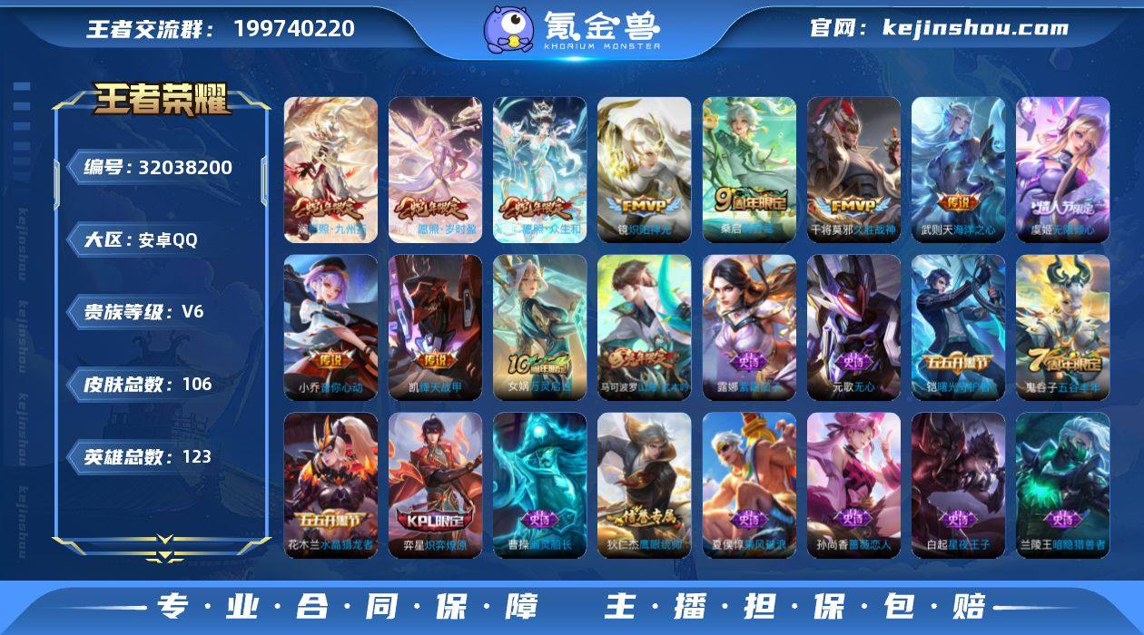 【WZ181075】安卓Q-最强王者段位-123英雄-106皮肤-10传说-26史诗【传说皮肤】:妲己愿照众生和,澜愿照九州拓,虞姬愿照岁时盈,桑启鸣野蒿,虞姬无限倾心,小乔音你心动,铠绛天战甲,镜炽阳神光,干将莫邪久胜战神,武则天海洋之心【限定皮肤】:姜子牙天穹之誓,狄仁杰阴阳师,赵云皇家上将,孙尚香蔷薇恋人,元歌无心,马可波罗山海玄木吟,狄仁杰魔术师,项羽海滩派对,兰陵王金庭之子,李元芳云中旅人,虞姬无限倾心,钟馗驱傩正仪,鬼谷子五谷丰年,沈梦溪大漠名商,裴擒虎擒涛扼浪,鲁班大师探海日志,桑启海盐诗旅,张良古海寻踪,鬼谷子天穹祈灯,刘邦剑破天穹,上官婉儿群星魔术团,程咬金群星魔术团,刘备异域游侠,周瑜熔金海岸【年限皮肤】:马可波罗山海玄木吟,妲己愿照众生和,澜愿照九州拓,虞姬愿照岁时盈【赛季限定】:钟馗驱傩正仪,兰陵王金庭之子,沈梦溪大漠名商,李元芳云中旅人,桑启海盐诗旅,裴擒虎擒涛扼浪,鲁班大师探海日志,张良古海寻踪,鬼谷子天穹祈灯,刘邦剑破天穹,姜子牙天穹之誓,东皇太一噬灭天穹,太乙真人谧流熔炉,甄姬逆浪荇歌,亚瑟荣光之誓【史诗皮肤】:女娲万灵启世,弈星炽弈燎原,上官婉儿群星魔术团,马可波罗山海玄木吟,元歌无心,鬼谷子五谷丰年,狄仁杰鹰眼统帅,孙策猫狗日记,白起星夜王子,李元芳逐浪之夏,铠曙光守护者,兰陵王暗隐猎兽者,夏侯惇乘风破浪,刘邦德古拉伯爵,花木兰水晶猎龙者,曹操幽灵船长,孙尚香水果甜心,孙尚香蔷薇恋人,宫本武藏鬼剑武藏,廉颇地狱岩魂,狄仁杰魔术师,王昭君偶像歌手,貂蝉圣诞恋歌,赵云皇家上将,露娜紫霞仙子,项羽苍穹之光【其他皮肤】:亚瑟荣光之誓,莱西奥踏浪烽翎,甄姬逆浪荇歌,明世隐景韶洛都,东皇太一金福满堂,太乙真人谧流熔炉,苍苍林狼骑,干将莫邪雾都夜雨,东皇太一噬灭天穹,盘古敬我三...