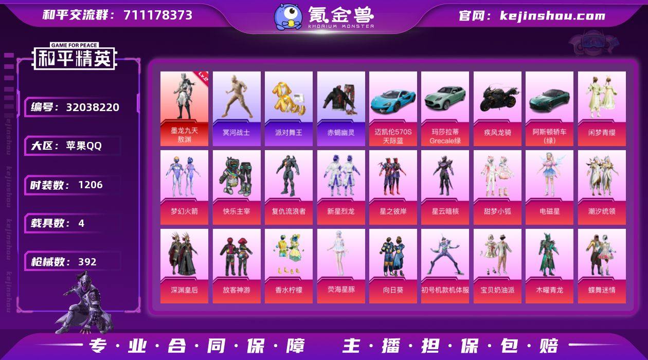 实名:可二次实名 是否支持人脸包赔:不支持 粉装数量:19 特效枪数量:12 载具数:4 时装数:1206 枪械数:392 冥河战士,赤蝎幽灵,派对舞王 二级墨龙九天-敖渊 宝贝奶油派,初号机款机体服,潮汐统领,电磁星,蝶舞迷情,复仇流浪者,放客神游,快乐主宰,梦幻火箭,木曜青龙,深渊皇后,甜梦小狐,闲梦青缨,向日葵,香水柠檬,新星烈龙,星云暗核,星之彼岸,荧海星豚 七级AUG-星之彼岸,七级DP-28-扶摇飞仙,七级Groza-香水柠檬,七级M416-心之恋语,七级M762-甜蜜誓约,七级PKM-江南烟雨,五级DP-28-豹影疾电,五级AKM-绿萝繁花,五级Kar98K-巳巳如意,五级SCAR-L-锦绣绵绵,三级M416-墨龙九天,三级Vector-最终圣卫者 阿斯顿·马丁DBS(绿),疾风龙骑,迈凯伦570S(天际蓝),玛莎拉蒂Grecale(薄荷绿) 狙击之神,SS37特训,青翼流星,月烬之祷,雪国风尚,SS36特训,冥河战士,炫彩糖果,绯色魅影,萌鸡速递,风迹短诗,秘语星愿,SS35特训,午间小调,元气之梦,漫游都市,懒羊羊,薄荷星砂,狂鲨锋刃,凌霄紫焰,擎苍青焰,SS34特训套装,游乐,朱霞炽焰,暗金炫舞,暗影哥特,暗夜傀儡,暗夜魅影,暗夜契约,冰川格斗者,冰川特警,冰冻风暴,缤纷果语,北国孤狼,滨海厨神,滨海假日,薄荷蓝莓,白虎圣者,冰河战士,爆裂葡萄,冰凉西瓜,白色伏地魔,冰爽海盐,白熊同盟,冰原使者,本愿之火,爆竹金鼠,纯白誓言,乘风破浪,彩虹兔,雏菊兔兔,长空猛禽,丛林猎人,潮流先锋,潮流游乐家,潮萌小黄鸭,传奇侦探,春日漫步,赤蝎幽灵,初雨海棠,炽焰拳师,纯真浪花,顶瓜瓜,蝶变,大橘大利,大橘为重,登山爱好者,淡雅花蕊,电音精灵,风暴特警,飞驰魅影,绯格组合,疯狂小兔子,粉恋花,粉甜马卡龙,风行保卫者,福星高照,飞行日记,格斗先锋,格斗专家,龟仙人,光之冒险,贵族骑装,鹤鸣,虎虎生威吉莉,红酒骑士,湖蓝色名流,活力之心,黑色伏地魔,灰色格斗者,幻世猎手,黄色名流,海上生明月,黄色运动,幻世战舞者,火舞潮人,红熊茄茄,辉星之火,湖雨初晴,黑夜传说,幻羽潜行,幻影武者,海洋之心,绝对偶像,金戈铁马,酒红色名流,惊鸿侠骨,竞技达人朋克,击剑大师,竞技名士,竞技勇士朋克,吉莉礼服,坚韧舞者,极速红龙,极速竞梦,金鼠迎春,街头潮人,街头风暴,锦衣飞扬,酷潮明星,空岛之星,科技之星,快乐星愿,狂沙舞者,狂徒小丑,狂战萌兔,蓝冰羽,蓝彩潮人,龙的传人,凛冬战士,拉斐尔,灵公主,鹿角斗士,玲珑飞花,萝兰蝴蝶,浪漫波比,黎明保卫者,浪漫天命,浪漫樱花,镭射皇者,龙腾端午,恋语绒绒,冷焰舞者,Mark.06,摩艾涂鸦,漫步者,猛禽,萌黄之夏,魅力单车,麻辣教官,懵萌河马,曼妙人鱼,梦起落英,萌趣颜团子,明日香款战斗服,明鸳圣池,梦魇先生,卖崽青蛙,弄潮海豚,逆风勇士,霓虹极客,霓虹街区,怒火燎原,霓虹闪烁,柠萌假日,牛气冲天,牛气满满,派对舞王,破蛋小黄鸡,朋克治安官,破晓战魂,青春冒险家,青春校园,情公主,拳皇97草薙京,奇迹天团,青龙圣者,绮丽涂鸦,奇趣企鹅,奇趣章鱼,蔷薇魔法师,青玉碎影,云朵鹅,瑞龙福将,软萌银虎,荣耀,热情海星,人气偶像,燃烧卡路里,热血青春,人鱼之吻,忍者信条,赛博空间,沙暴袭击者,丝绸行者,圣诞大吉,森林猎手,沙漠兵团,神秘领域,沙漠雄狮,神奈川冲浪里,神气柴柴,SS10特训,SS11特训,SS12特训,SS13特训,SS14特训,SS15特训,SS16特训,SS17特训,SS18特训,SS19特训,SS20特训,S