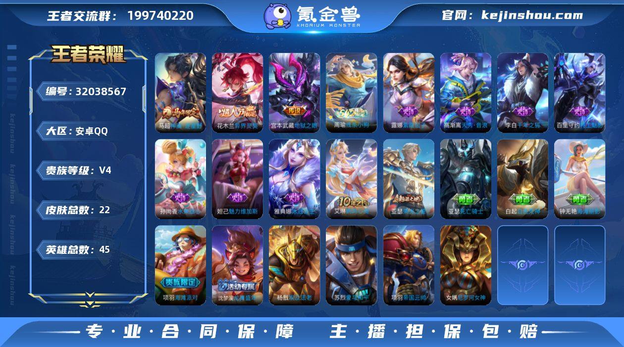 【小号推荐·马超神骥逐星野,花木兰异界灵契,宫本武藏地狱之眼·可二次】YXw16845-安卓Q-45英雄-22皮肤-1王者印记-0铭文-贵族积分0【贵族4】【3传说·2按键】【因赛季更新游戏段付以上号为准!】 【传说皮肤】:马超神骥逐星野,花木兰异界灵契,宫本武藏地狱之眼 【限定皮肤】:项羽海滩派对,沈梦溪龙舞盛年 【赛季限定】:亚瑟荣光之誓 【战令限定】:周瑜线条小狗 【史诗皮肤】:露娜紫霞仙子,孙尚香水果甜心,妲己魅力维加斯,李白千年之狐,雅典娜冰冠公主,百里守约特工魅影,高渐离天秀音浪,周瑜线条小狗 【其他皮肤】:项羽海滩派对,白起白色死神,亚瑟死亡骑士,钟无艳海滩丽影,沈梦溪龙舞盛年,亚瑟荣光之誓,艾琳鹤鸣心笺,项羽帝国元帅,杨戬埃及法老,苏烈爱与和平,女娲尼罗河女神