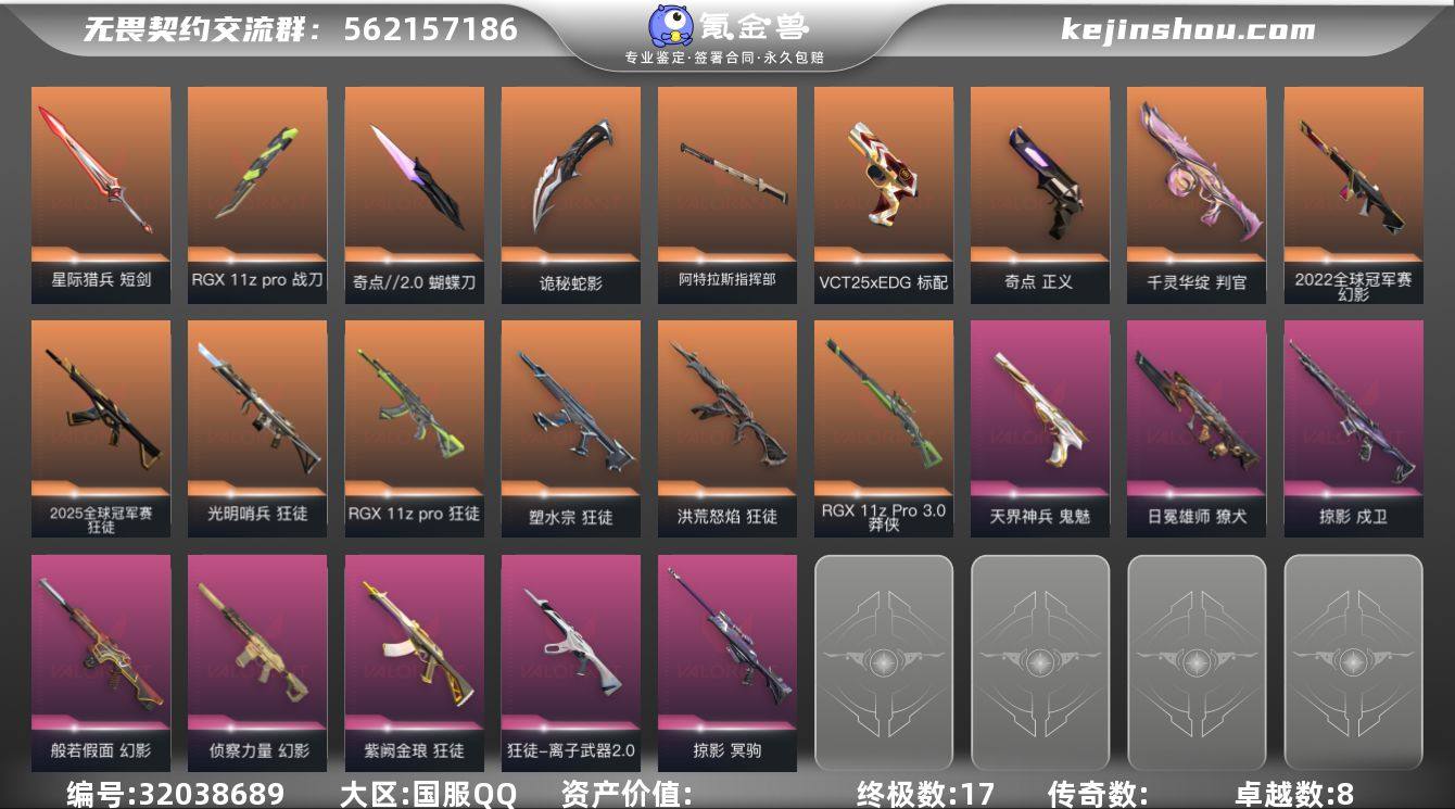 精品钻石捡漏号都是热门皮肤 qyz9071 【近战武器】:近战武器-2022全球冠军赛 蝴蝶刀,近战武器-无畏契约季前邀请赛 悲悯之刃,近战武器-流风回雪,近战武器-RGX 11z Pro//3.0 爪刀,近战武器-黑波之刃,近战武器-镭切,近战武器-诡秘蛇影 军刀,近战武器-神圣领域 战刀,近战武器-日耀风暴 遗器,近战武器-阿特拉斯指挥部 甩棍,近战武器-星际猎兵 短剑 【狂徒】:狂徒-超时空卫队,狂徒-洪荒怒焰,狂徒-机动狂飙,狂徒-RGX 11z Pro,狂徒-般若假面//2.0,狂徒-堕天遗武,狂徒-掠影,狂徒-耀鳞威龙,狂徒-诡秘蛇影 【幻影】:幻影-2022全球冠军赛,幻影-电音光谱,幻影-神圣领域,幻影-末日之翼,幻影-电音光谱 【戍卫】:戍卫-噬影者,戍卫-月球哨兵,戍卫-折光棱晶 【獠犬】:獠犬-神圣领域 【冥驹】:冥驹-离子武器,冥驹-星云暗涌 【飞将】:飞将-末日之翼 【莽侠】:莽侠-诡秘蛇影,莽侠-月球哨兵 【战神】:战神-神圣领域 【奥丁】:奥丁-末日之翼 【判官】:判官-诡秘蛇影 【雄鹿】:雄鹿-月球哨兵 【骇灵】:骇灵-星云暗涌 【蜂刺】:蜂刺-混沌序曲,蜂刺-星云暗涌,蜂刺-折光棱晶 【标配】:标配-堕天遗武,标配-折光棱晶 【正义】:正义-奇点,正义-西部未来,正义-月球哨兵 【鬼魅】:鬼魅-奇幻朋克,鬼魅-诡秘蛇影,鬼魅-星云暗涌 【狂怒】:狂怒-神圣领域 【短炮】:短炮-末日之翼 【卡面】:南瓜盛典 卡面,无畏契约:暮蝶 卡面,铁之华 卡面,战术小伙伴的夏日 卡面,哨卫者之领域 卡面,源能反应 卡面,别冒尖 卡面,壹决工牌 卡面,代号红色 卡面,新兵报到 卡面,V契约 卡面,无畏契约 卡面 【喷漆】:控场勿近 喷漆,伤心心 喷漆,胜利属于无畏契约 喷漆,GLHF 喷漆,无畏契约 喷漆 【挂饰】:V25第六幕:超凡 挂饰,第九季//第三幕 纪念币 挂饰,高丽风情 挂饰,无畏契约 纪念币 挂饰
