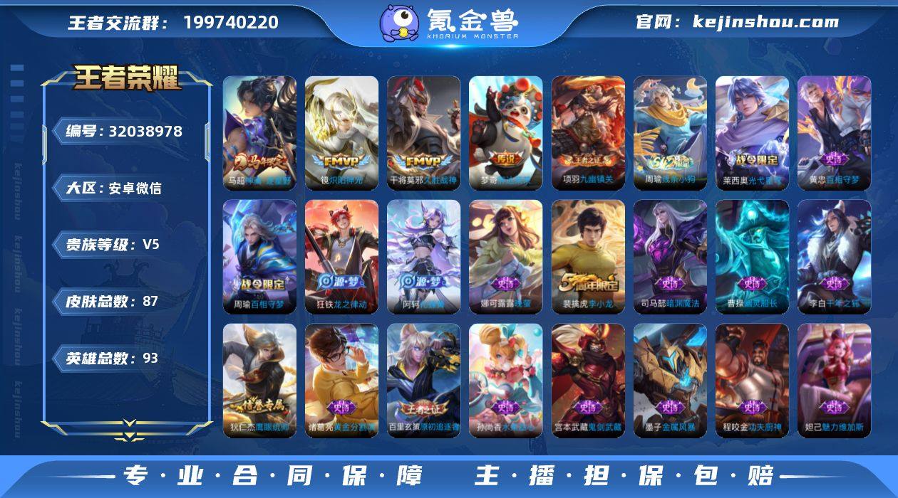 实名: 可修改 性别: 男号 贵族等级: V5 英雄数: 93 皮肤数: 87 传说皮: 久胜战神,炽阳神光,胖达荣荣,神骥·逐星野 限定皮: 李小龙 亮点: 【优质装备】:久胜战神,炽阳神光,胖达荣荣