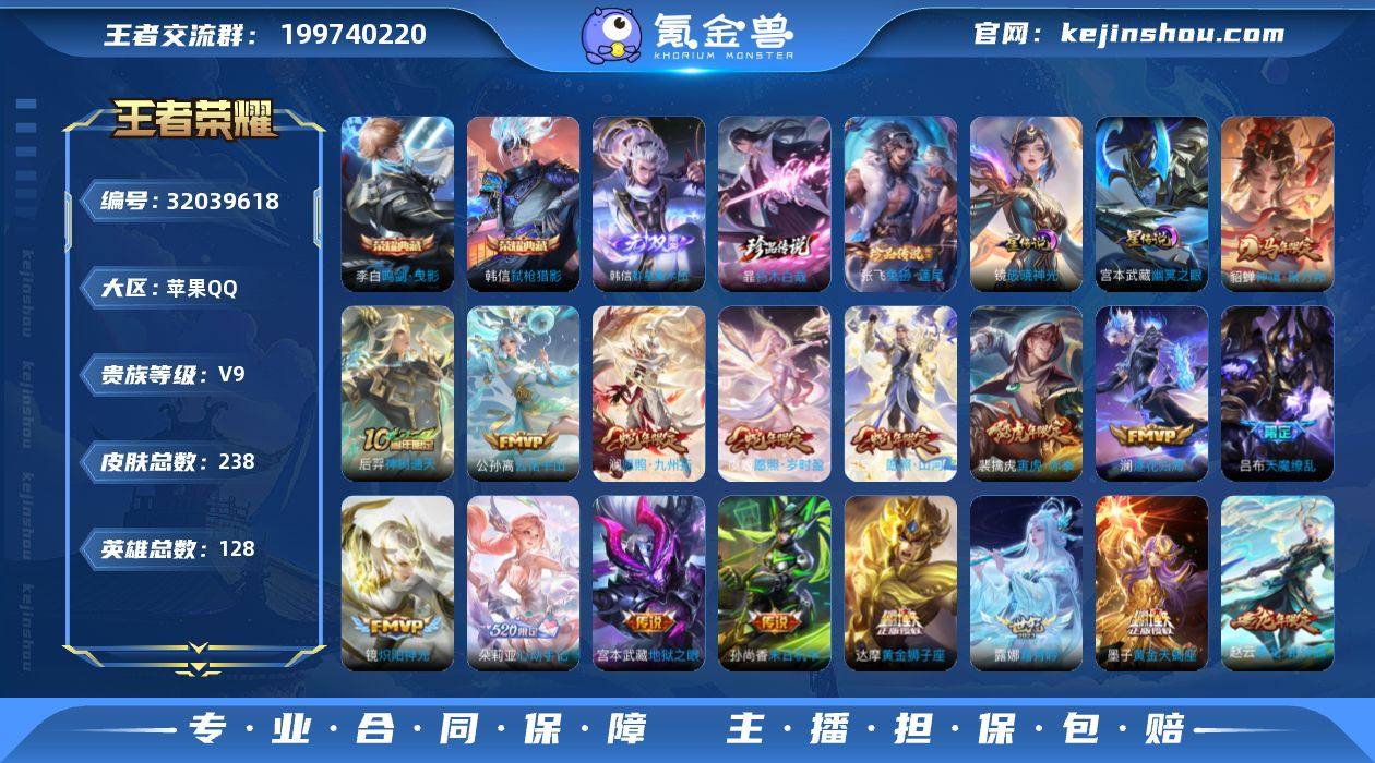 S2-YJ11378 苹果QQ V9 238皮 2典藏1无双2珍品传说2星元 81限定24传说 27按键 巅峰1533 打野39段 金标韩信曹操赵云 2519星币 204幸运值 4荣耀印记 932亲密玫瑰 6改名卡 营地号:1756398569【珍品传说】兔狲·蓬尾,朽木白哉, 【无 双】韩信群星魔术团, 【荣耀典藏】鸣剑·曳影,弑枪猎影, 【星元皮肤】幽冥之眼,破晓神光, 【热门限定】神骥·聚万邦,愿照·岁时盈,愿照·山河定,愿照·九州拓,逐花归海,至尊宝,乘龙·铭钟鼎,神威,天魔缭乱,曦玄引男,超元猎域,寅虎·赤拳,淬星耀世,冰霜恋舞曲,启明星使,匿光决锋者,涂山容容, 【限定传说】电玩小子,孙行者,地狱之眼,诗语江南,修罗,未来纪元,神迹守卫,炽阳神光,黄金狮子座,天秀·启明,黄金分割率,超时空战士,魅语,晚萤,末日机甲男,末日机甲女,暗隐猎兽者,霜月吟,水晶猎龙者,金属风暴,朵莉亚心动手记,地狱岩魂,特工魅影,曙光守护者,圣诞恋歌,舞动绿茵,逐浪之夏,紫霞仙子,功夫厨神,心灵骇客,幽灵船长,乘风破浪,圣诞狂欢,星夜王子,赏金猎手,永昼,节奏热浪,天才门将,绅士熊喵,暗夜贵公子,偶像歌手,街头霸王,暗渊魔法,乐园奇幻夜,缤纷独角兽,鬼剑武藏,德古拉伯爵,银河之约,猎兽之王,冰冠公主,花好人间,拳王,敏锐之力,丁香结,炽阳神光,赏金猎手,