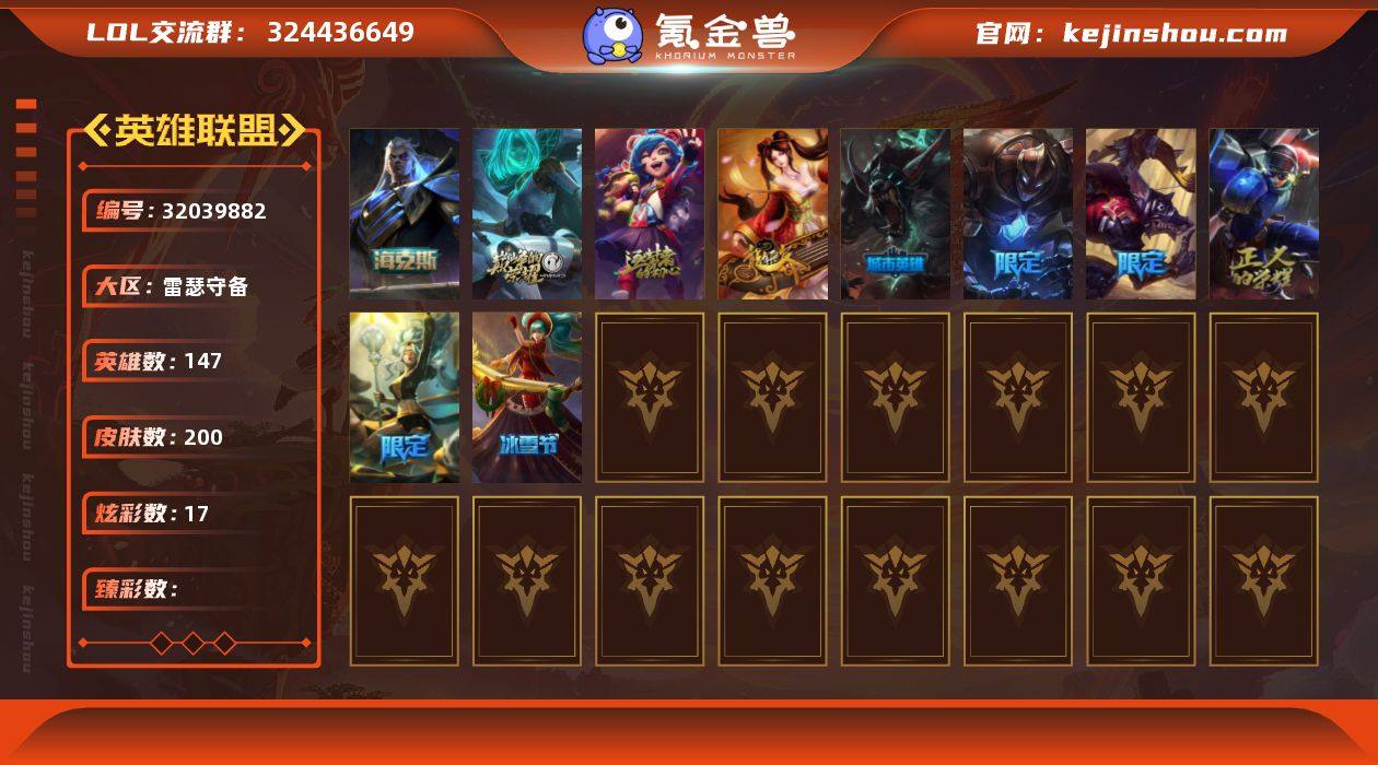 黄金段位-172英雄-143皮肤-50炫彩-2终极-1神话-21限定-11传说-35史诗 【神话皮肤】:十五周年纪念希维尔 【臻彩皮肤】:斗魂觉醒拉克丝无限斗志,霸天战士雷恩加尔星啸天火,源计划毁灭派克幻灭,天煞劫恒星游历者,星之吞噬者莫甘娜热情之末,魔女阿卡丽虚荣 【年限皮肤】:龙马烈焰波比 【冰雪限定】:阿木木“主人不要我了” 【终极皮肤】:DJ娑娜,未来战士伊泽瑞尔 【限定皮肤】:Fnatic迦娜,暗杀星努努和威朗普,暗杀星慎,SSW泰隆,SSW雷恩加尔,DWG蕾欧娜,暗裔英雄盖伦,胜利凤凰艾尼维亚,胜利之王泰达米尔,胜利巨口克格莫,胜利女神娑娜,胜利剑圣易,胜利之运崔斯特,胜利女神菲奥娜,无头骑士赫卡里姆,暗影沃里克,都铎王朝图奇,玉剑传说舞龙卫 【传说皮肤】:钢铁之翼凯尔,约德尔国队长提莫,驯龙炮手崔丝塔娜,律政大亨蒙多,冰川巨兽墨菲特,屠龙勇士潘森,星之守护者阿卡丽,钢铁军团盖伦,黯黑魔龙希瓦娜,宇航员诺提勒斯,泳池派对吉格斯 【史诗皮肤】:冰霜烈焰安妮,屠龙勇士赵信,圣光审判凯尔,战争机器赛恩,钢铁之心希维尔,月光女神阿忒弥斯索拉卡,熊猫提莫,黑色荆棘莫甘娜,特种部队普朗克,血石诅咒塔里克,穿着正装的恶魔维迦,绝代智将斯维因,古墓丽影凯特琳,无畏号墨菲特,沙漠风暴卡特琳娜,枯萎之壤雷克顿,龙骑统帅嘉文四世,凯旋英雄嘉文四世,三昧真火孙悟空,V字仇杀者布兰德,灵魂烈焰布兰德,防弹武僧李青,生化博士黑默丁格,面包之王潘森,铁血女忍阿卡丽,帝王斑蝶克格莫,星际迷航拉克丝,黑帮教父格雷福斯,暗星韦鲁斯,绞肉机刽子手德莱文,沙之守护卡兹克,屠龙勇士布隆,猛虎布隆,职业杀手卢锡安,河水之灵娜美 【王者皮肤】:战地之王加里奥 【勇士皮肤】:冰河时代奥拉夫 【其他皮肤1】:幽蓝梦魇加里奥,探戈灵魂崔斯特,幽魂费德提克,暗影易,腥红之...