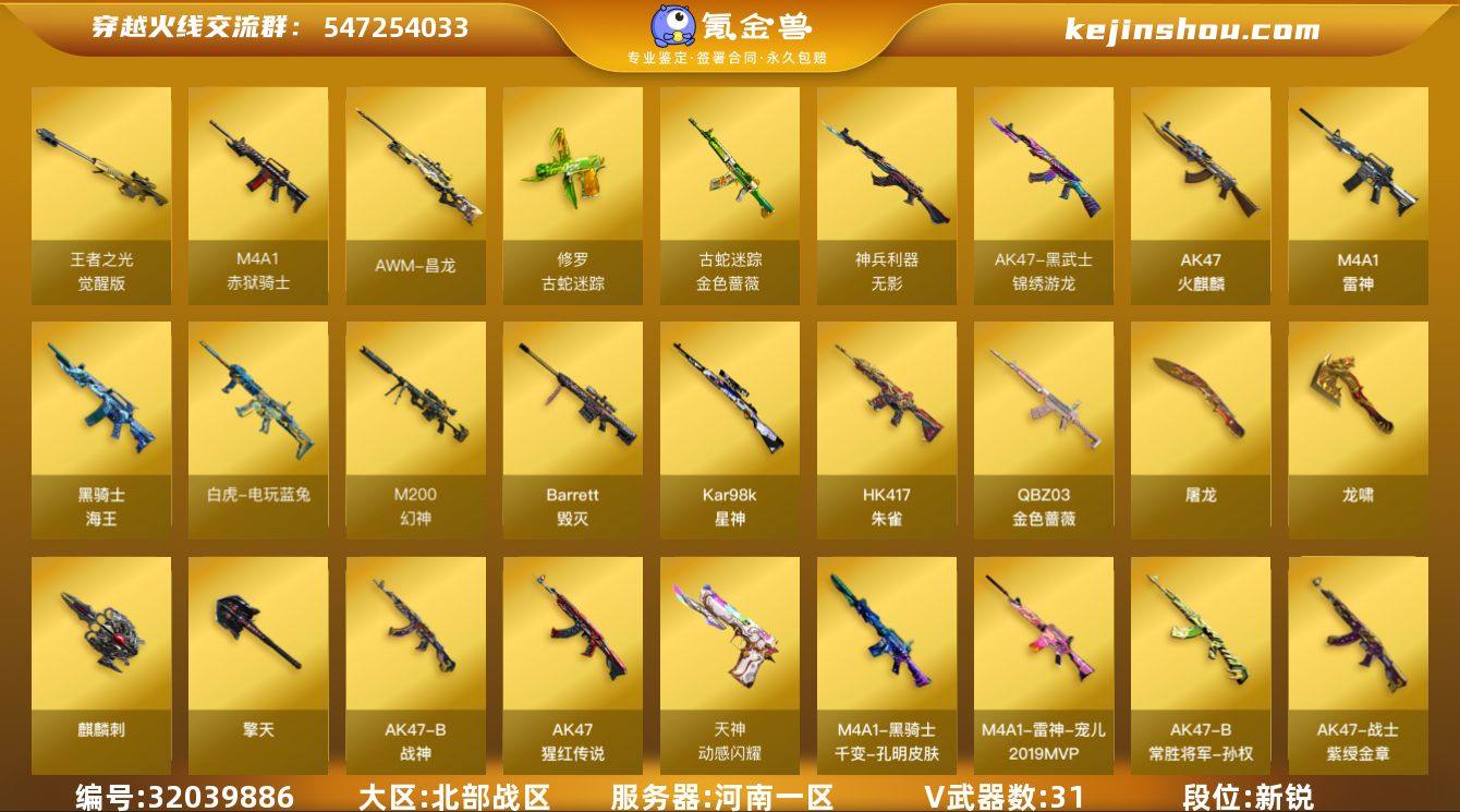 【ky5929】河南一区-33V-21王者武器数-0炫金武器数 【热门武器】:QBZ03-金色蔷薇,HK417-朱雀,M200-幻神,金色蔷薇-古蛇迷踪,修罗-古蛇迷踪,死亡之眼,白虎-电玩蓝兔,Kar98K-星神 【音效卡】:火线妹语音包 【皮肤】:幻神-荣耀世冠EP 皮肤,白虎-AG-CFPLS20冠军,QBZ03-荣耀世冠EP 皮肤,星神-漫游,雷神-荣耀之魄,雷神-宠儿-2019MVP,火麒麟-平天大圣,火麒麟-心动糖果,毁灭-SV-CFPLS16冠军,毁灭-BEAN-2020MVP,毁灭-黑大圣皮肤,毁灭-直播专属,M4A1-千变-孔明皮肤,战神-紫绶金章皮肤,AK47-B-常胜将军-孙权,天神-暗月,龙啸-冠军之啸,擎天-秘银,麒麟刺-甜蜜糖果 皮肤 【角色】:电竞教官-云悠悠,战地猎狐,王者凌霄,蛇隐宗,乔伊教练,暗夜-X,初恋灵狐,芳心审判者,风暴女,嘉年华灵狐,娟娟,灵狐者-七夕宝贝,龙儿-小淘气,曼陀罗-礼服,女主播,潘多拉-X,潘多拉-甜心教官,邱刚敖,蛇姬,斯沃特-X,兔囡囡,樱-战斗天使,职业选手 【人偶武器】:天龙-曼陀罗,AWM-灵狐-15周年嘉年华,迷你深渊冰龙,迷你裂空之翼,迷你牛魔王,夺魂,迷你牛牛,深渊终结者手雷,迷你深渊冰龙-王绿豆,迷你超能女侍 【暴走生化】:黑龙吞噬者,死亡之眼,超级对讲机 【挑战大师】:神圣爆裂者III,冰龙粉碎者-白马银枪,激光毁灭者III,试炼破坏者III,神圣爆裂者-末日III*3 【英雄级武器】:AK47-火麒麟,M4A1-雷神,HK417-朱雀,QBZ03-天罚,无影-神兵利器,黑武士-锦绣游龙,金色蔷薇-古蛇迷踪,QBZ03-金色蔷薇,AK-47-猩红传说,AK47-B-战神,黑骑士-海王,白虎-电玩蓝兔,Barrett-毁灭,M200-幻神,Kar98K-星神,王者之光-觉醒版,柯尔特-荣耀世冠EP,天神-动感闪耀,修罗-古蛇迷踪,屠龙,龙啸,擎天,麒麟刺*2,高爆手雷-幻灵,手雷-动感闪耀,高爆手雷-古蛇迷踪,闪光弹-幻灵,烟雾弹-幻灵,烟雾...