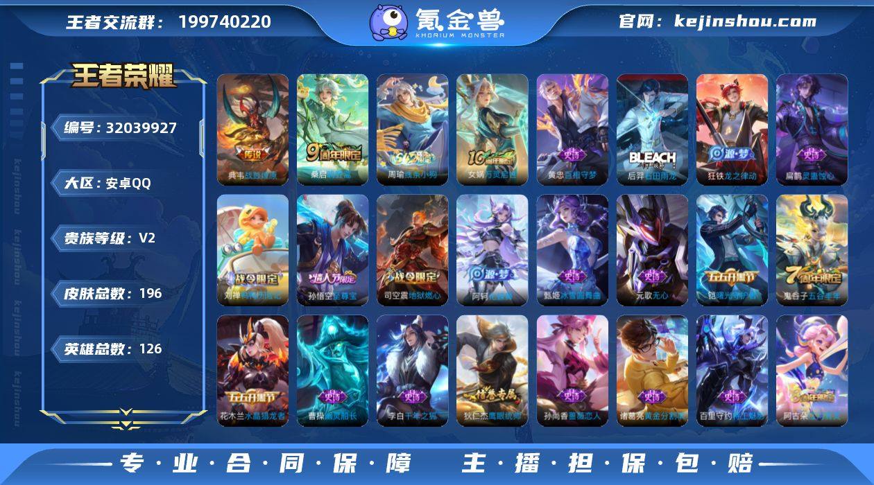 安卓Q-V2-永恒钻石III段位-126英雄-196皮肤-2传说-38史诗 【英雄全皮】:孙权全皮 【传说皮肤】:桑启鸣野蒿,典韦战鼓燎原 【限定皮肤】:大乔绒语心约,姜子牙天穹之誓,狄仁杰阴阳师,赵云皇家上将,孙尚香蔷薇恋人,高渐离玩趣恶龙,钟无艳超时空战士,元歌无心,甄姬游园惊梦,甄姬落雪兰心,狄仁杰魔术师,达摩沙漠行僧,项羽海滩派对,兰陵王金庭之子,孙悟空至尊宝,李元芳云中旅人,鬼谷子五谷丰年,苏烈千军破阵,沈梦溪大漠名商,上官婉儿神器万象笔,鲁班大师探海日志,桑启海盐诗旅,艾琳流音漫舞,司空震地狱燃心,阿古朵江河有灵,张良古海寻踪,鬼谷子天穹祈灯,沈梦溪龙舞盛年,刘邦剑破天穹,程咬金群星魔术团,周瑜熔金海岸 【赛季限定】:苏烈千军破阵,达摩沙漠行僧,兰陵王金庭之子,沈梦溪大漠名商,李元芳云中旅人,桑启海盐诗旅,鲁班大师探海日志,张良古海寻踪,鬼谷子天穹祈灯,刘邦剑破天穹,姜子牙天穹之誓,东皇太一噬灭天穹,太乙真人谧流熔炉,钟馗虚灵犬护,甄姬逆浪荇歌,亚瑟荣光之誓 【战令限定】:钟无艳超时空战士,甄姬落雪兰心,司空震地狱燃心,艾琳流音漫舞,刘禅鸭鸭历险记,沈梦溪鸭鸭历险记,周瑜线条小狗 【史诗皮肤】:周瑜线条小狗,女娲万灵启世,黄忠百相守梦,后羿石田雨龙,扁鹊灵蛊蚀心,狂铁龙之律动,刘禅鸭鸭历险记,阿轲化蝶舞,阿古朵江河有灵,司空震地狱燃心,元歌无心,上官婉儿神器万象笔,鬼谷子五谷丰年,钟无艳超时空战士,狄仁杰鹰眼统帅,孙策猫狗日记,李元芳逐浪之夏,铠曙光守护者,百里守约特工魅影,雅典娜冰冠公主,亚瑟心灵战警,甄姬游园惊梦,诸葛亮黄金分割率,兰陵王暗隐猎兽者,小乔缤纷独角兽,花木兰水晶猎龙者,孙悟空至尊宝,张飞乱世虎臣,李白千年之狐,曹操幽灵船长,墨子金属风暴,妲己魅力维加斯,孙尚香水果甜心,孙...