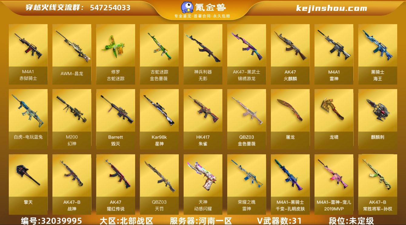 河南一区-33V-21王者武器数-0炫金武器数 【热门武器】:QBZ03-金色蔷薇,HK417-朱雀,M200-幻神,金色蔷薇-古蛇迷踪,修罗-古蛇迷踪,死亡之眼,白虎-电玩蓝兔,Kar98K-星神 【音效卡】:火线妹语音包 【皮肤】:幻神-荣耀世冠EP 皮肤,白虎-AG-CFPLS20冠军,QBZ03-荣耀世冠EP 皮肤,星神-漫游,雷神-荣耀之魄,雷神-宠儿-2019MVP,火麒麟-平天大圣,火麒麟-心动糖果,毁灭-SV-CFPLS16冠军,毁灭-BEAN-2020MVP,毁灭-黑大圣皮肤,毁灭-直播专属,M4A1-千变-孔明皮肤,战神-紫绶金章皮肤,AK47-B-常胜将军-孙权,天神-暗月,龙啸-冠军之啸,擎天-秘银,麒麟刺-甜蜜糖果 皮肤 【角色】:电竞教官-云悠悠,战地猎狐,王者凌霄,蛇隐宗,乔伊教练,暗夜-X,初恋灵狐,芳心审判者,风暴女,嘉年华灵狐,娟娟,灵狐者-七夕宝贝,龙儿-小淘气,曼陀罗-礼服,女主播,潘多拉-X,潘多拉-甜心教官,邱刚敖,蛇姬,斯沃特-X,兔囡囡,樱-战斗天使,职业选手 【人偶武器】:天龙-曼陀罗,AWM-灵狐-15周年嘉年华,迷你深渊冰龙,迷你裂空之翼,迷你牛魔王,夺魂,迷你牛牛,深渊终结者手雷,迷你深渊冰龙-王绿豆,迷你超能女侍 【暴走生化】:黑龙吞噬者,死亡之眼,超级对讲机 【挑战大师】:神圣爆裂者III,冰龙粉碎者-白马银枪,激光毁灭者III,试炼破坏者III,神圣爆裂者-末日III*3 【英雄级武器】:AK47-火麒麟,M4A1-雷神,HK417-朱雀,QBZ03-天罚,无影-神兵利器,黑武士-锦绣游龙,金色蔷薇-古蛇迷踪,QBZ03-金色蔷薇,AK-47-猩红传说,AK47-B-战神,黑骑士-海王,白虎-电玩蓝兔,Barrett-毁灭,M200-幻神,Kar98K-星神,王者之光-觉醒版,柯尔特-荣耀世冠EP,天神-动感闪耀,修罗-古蛇迷踪,屠龙,龙啸,擎天,麒麟刺*2,高爆手雷-幻灵,手雷-动感闪耀,高爆手雷-古蛇迷踪,闪光弹-幻灵,烟雾弹-幻灵,烟雾弹-古蛇迷踪...