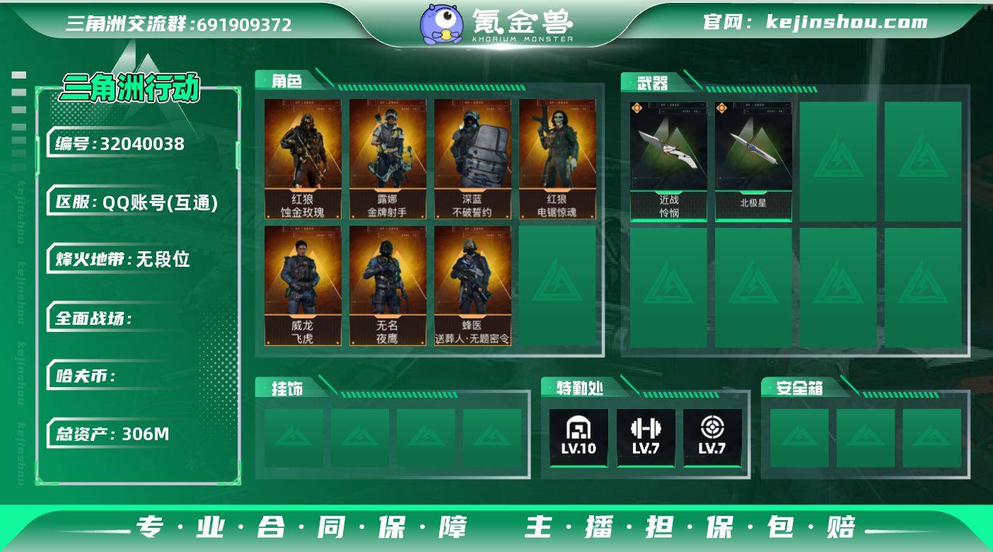306m总资产【干员外观】:红狼蚀金玫瑰,露娜金牌射手,威龙飞虎,蜂医送葬人无题密令,无名夜鹰,电锯惊魂,深蓝不破誓约【近战皮肤】:北极星,怜悯