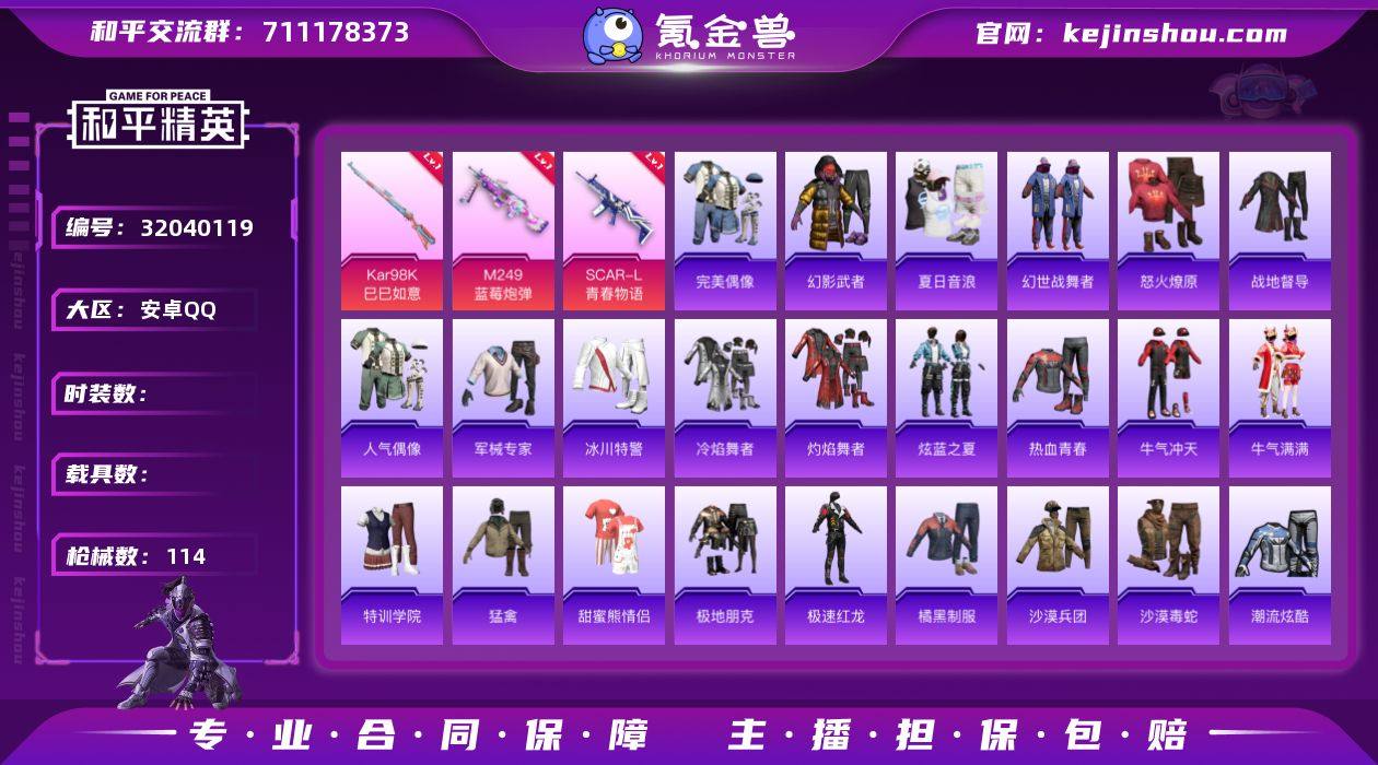 安卓 手Q-0粉装-5特效枪-0载具-0粉色飞行器-36378热力值-6王牌印记-120套装-114枪皮 【热门品类】:角色-军刀雅典娜,套装-金羽特工,套装-龟仙人 【粉色枪皮等级】:SCAR-L-青春物语(七级),Kar98K-巳巳如意(五级),Mk14-福马献瑞(五级),M249-蓝莓炮弹(四级),DP-28-豹影疾电(五级) 【粉色枪皮】:SCAR-L-青春物语,Kar98K-巳巳如意,Mk14-福马献瑞,M249-蓝莓炮弹,DP-28-豹影疾电 【粉色降落伞】:梦幻火箭降落伞,海渊国主降落伞,暗星紫秘降落伞,环太平洋降落伞,炫彩糖果降落伞 【稀有套装】:套装-龟仙人,套装-马上有钱,套装-蜜露汐语,角色-紫俏灵猫 【稀有枪皮】:AKM-夜灯,AKM-彩虹符号,AKM-灼热熔岩,AKM-破晓战魂,AKM-萌趣颜团子,AKM-虎虎生威,AKM-霓虹街区,AKM-龙的传人,M16A4-幻世战舞者,M16A4-甜心亚梦,SCAR-L-炫彩节奏,SCAR-L-玉兔迎春,SCAR-L-红色方程式,M416-夜灯,M416-红色方程式,M416-蓝色火焰,GROZA-异彩先驱,AUG-天降萌叽,AUG-耀粉歌者,QBZ-彩虹符号,M762-瑞龙福将,G36C-暗夜玫瑰,AC-VAL-天降萌叽,AC-VAL-甜心亚梦,蜜獾-天降萌叽,蜜獾-娇憨猪猪,UZI-天降萌叽,UZI-娇憨猪猪,UZI-炫彩节奏,UMP45-夜灯,UMP45-生命誓言,UMP45-蓝色火焰,Vector-彩虹符号,Vector-暗夜玫瑰,Vector-生命誓言,汤姆逊-异彩先驱,汤姆逊-炫彩节奏,汤姆逊-耀粉歌者,MP5K-异彩先驱,P90-巳巳如意,Kar98K-彩虹符号,Kar98K-炫彩节奏,M24-影袭,SKS-炫彩节奏,Mini14-异彩先驱,Mini14-炫彩节奏,Mini14-耀粉歌者,Win94-瑞龙福将,SLR-娇憨猪猪,QBU-烈焰拳霸,S686-生命誓言,S686-红色方程式,S1897-炫彩节奏,S12K-瑞龙福将,S12K-破晓战魂,S12K-娇憨猪猪,S1