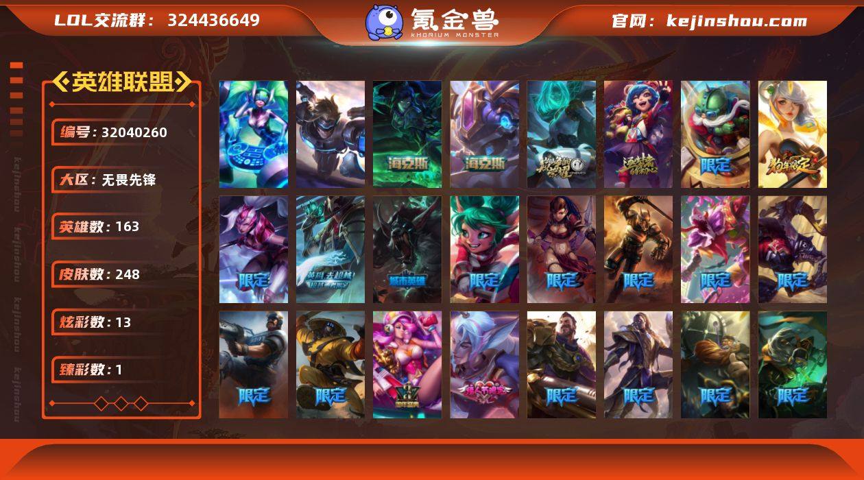 未定级段位-163英雄-248皮肤-13炫彩-2终极-5神话-42限定-28传说-67史诗 【臻彩皮肤】:偶像歌手阿狸极地雪莲 【年限皮肤】:碧玉之牙卡西奥佩娅,春晖神女拉克丝 【海克斯皮肤】:摄魂使者薇恩,海克斯科技克格莫 【情人节限定】:甜心之翎洛 【冰雪限定】:圣诞开心鬼提莫,圣诞精灵崔丝塔娜,圣诞狂欢努努和威朗普,圣诞狂欢基兰,邪恶圣诞老人维迦,夺命美人卡特琳娜,雪默丁格,圣诞玩偶波比,圣诞驯鹿克格莫,魄罗骑士瑟庄妮,冰雪节辛吉德 【终极皮肤】:DJ娑娜,未来战士伊泽瑞尔 【神话皮肤】:十周年纪念安妮,源代码乐芙兰,神凰行者瑞羽圣凰艾尼维亚,海克斯科技克格莫,摄魂使者薇恩 【限定皮肤】:卧虎藏龙贾克斯,地底世界崔斯特,Fnatic古拉加斯,Fnatic卡尔萨斯,暗杀星蒙多,暗杀星慎,SKTT1贾克斯,SSW辛吉德,SSW图奇,SSW锤石,SKTT1烬,电玩女神厄运小姐,胜利枪神格雷福斯,胜利枪神卢锡安,海贼瑞兹,灵魂收割者索拉卡,鬼影重重魔腾,鬼影森森茂凯,泳池派对雷克顿,女猎手希维尔,外星装甲库奇,暗影沃里克,波比的巧克力工坊,勇者奈德丽,都铎王朝图奇,防暴士兵格雷福斯,惊悚派对费德提克,警用试作体K9内瑟斯 【传说皮肤】:战地机甲厄加特,血石领主弗拉基米尔,战场女武神凯尔,钢铁之翼凯尔,欧米伽小队幽灵特工,女皇艾希,源计划联合艾希,鬼魂新娘莫甘娜,绅士科加斯,战地巨兽科加斯,冰霜之刃艾瑞莉娅,女主播迦娜,红色男爵库奇,女警狙击凯特琳,地狱行者孙悟空,丧尸布兰德,银河魔装机神兰博,第三类接触黑默丁格,钢铁军团盖伦,枯萎之壤泽拉斯,偶像歌手阿狸,符文战熊沃利贝尔,宇航员诺提勒斯,泳池派对吉格斯,霸天异形卡兹克,灌篮高手德莱厄斯,神王德莱厄斯,暗星锤石 【史诗皮肤】:冰霜烈焰安妮,皇家火枪手崔斯特,摄魂男爵弗拉基米尔,圣光审判凯尔,铁血...