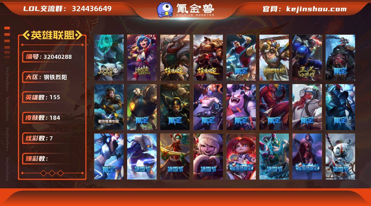 【184皮肤2神话31限定25传说】未定级段位-155英雄-184皮肤-7炫彩-0终极-2神话-31限定-25传说-52史诗 【年限皮肤】:张辽文远,司马懿仲达 【情人节限定】:觅心之翼奎因 【冰雪限定】:幸福女神乐芙兰,圣诞精灵崔丝塔娜,阿木木“主人不要我了”,平安夜女神娑娜,邪恶圣诞老人维迦,喜庆之树茂凯,雪默丁格,雪装奈德丽,圣诞玩偶波比,圣诞老人古拉加斯,冰雪节辛吉德,冰雪节玛尔扎哈 【神话皮肤】:十周年纪念安妮,源代码乐芙兰 【限定皮肤】:战熊骑士瑟庄妮,钢铁军团拉克丝,Fnatic嘉文四世,暗杀星奥莉安娜,暗杀星努努和威朗普,SKTT1李青,SSW辛吉德,SKTT1阿兹尔,SKTT1伊莉丝,胜利机器人布里茨,海贼瑞兹,南瓜头费德提克,无头骑士赫卡里姆,野兽猎人泰达米尔,制胜金靴李青,防暴天使凯尔 【传说皮肤】:地狱之门卫士加里奥,战地机甲厄加特,源计划林易,约德尔国队长提莫,合金巨兽努努和威朗普,恶魔之刃泰达米尔,鬼魂新娘莫甘娜,战地巨兽科加斯,律政大亨蒙多,电玩女神娑娜,红色男爵库奇,地狱行者孙悟空,神拳李青,第三类接触黑默丁格,屠龙勇士潘森,枯萎之壤泽拉斯,黯黑魔龙希瓦娜,焰尾妖狐阿狸,苍穹之光韦鲁斯,女校长菲奥娜,霸天异形卡兹克,灌篮高手德莱厄斯,神王德莱厄斯,黑夜使者亚索,西部魔影卢锡安 【史诗皮肤】:安伯斯与提妮,摄魂男爵弗拉基米尔,圣光审判凯尔,战争机器赛恩,战场公主希维尔,黑帮狂花厄运小姐,国王泰达米尔,百夫长贾克斯,黑色荆棘莫甘娜,炼金狂士辛吉德,殇之机器人阿木木,武动巅峰萨科,战争血统蒙多,穿着正装的恶魔维迦,绝代智将斯维因,铁血狙击手凯特琳,源计划雄心卡特琳娜,符文战神雷克顿,龙骑统帅嘉文四世,凯旋英雄嘉文四世,暗星奥莉安娜,灵魂烈焰布兰德,至高之拳李青,地下拳王李青,深海妖姬卡西奥佩娅,四神之力乌迪尔,飞...