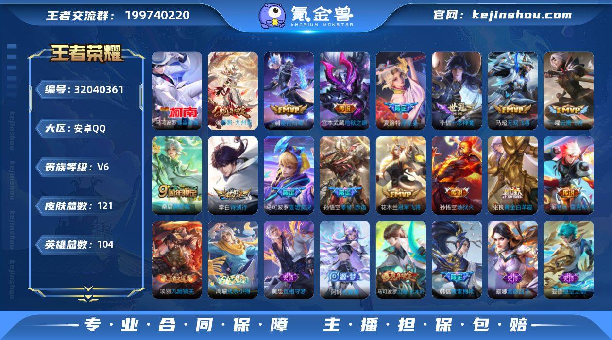 安卓Q-V6-永恒钻石III段位-104英雄-121皮肤-1珍品传说-15传说-36史诗 【英雄全皮】:澜全皮 【珍品传说】:马可波罗怪盗基德 【传说皮肤】:澜愿照九州拓,桑启鸣野蒿,澜逐花归海,马可波罗妄想实况,澜电玩雷克斯,夏洛特浮生妄,李白诗剑行,马超无双飞将,孙悟空零号赤焰,曜云鹰飞将,李信一念神魔,张良黄金白羊座,花木兰冠军飞将,宫本武藏地狱之眼,孙悟空地狱火 【限定皮肤】:姜子牙天穹之誓,李白谪仙醉月,狄仁杰阴阳师,赵云皇家上将,墨子降魔,马可波罗山海玄木吟,马可波罗妄想实况,狄仁杰魔术师,项羽海滩派对,韩信傲雪梅枪,孙悟空零号赤焰,裴擒虎李小龙,夏洛特浮生妄,暃星界游侠 【年限皮肤】:马可波罗山海玄木吟,澜愿照九州拓 【赛季限定】:姜子牙天穹之誓,东皇太一噬灭天穹,太乙真人谧流熔炉,钟馗虚灵犬护,甄姬逆浪荇歌,项羽九幽镇关 【战令限定】:暃星界游侠,亚连破空之剑,廉颇撼地雄心,孙悟空神迹守卫,百里守约百相守梦,老夫子百相守梦,孙膑茶境仙,马超访茗客,周瑜线条小狗 【史诗皮肤】:周瑜线条小狗,项羽九幽镇关,黄忠百相守梦,阿轲化蝶舞,孙膑茶境仙,百里守约百相守梦,李白谪仙醉月,马可波罗星界特工,亚连破空之剑,廉颇撼地雄心,马可波罗山海玄木吟,暃星界游侠,墨子降魔,澜赏金猎手,韩信傲雪梅枪,司马懿暗渊魔法,百里玄策热力回旋,裴擒虎李小龙,孙尚香时之恋人,狄仁杰鹰眼统帅,阿轲节奏热浪,程咬金功夫厨神,铠曙光守护者,百里守约特工魅影,安琪拉心灵骇客,夏侯惇乘风破浪,花木兰水晶猎龙者,曹操幽灵船长,墨子金属风暴,妲己女仆咖啡,妲己魅力维加斯,孙尚香水果甜心,宫本武藏鬼剑武藏,狄仁杰魔术师,王昭君偶像歌手,赵云皇家上将,露娜紫霞仙子 【其他皮肤】:兰陵王雾影缉谜,张良罗小黑战记,哪吒罗小黑战记,鬼谷子克喵,...