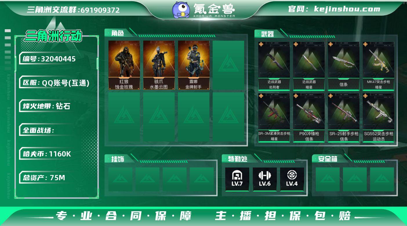 "yxb-75m总资产-1160k哈伏币-52m流动资产-S8赛季3x3-60烽火等级-钻石-1战场等级-无军衔-特勤-仓库7-指中3-训中6-靶场4-部门22222 【干员外观】:红狼-蚀金玫瑰,骇爪-水墨云图,露娜-金牌射手 【近战皮肤】:近战-暗星,近战-信条,近战-处刑者,近战-黑鹰 【传说外观】:M4A1突击步枪-蚀金玫瑰,AKM突击步枪-钢铁意志,SG552突击步枪-运动员,SCAR-H战斗步枪-水墨云图,MK47突击步枪-暗星,P90冲锋枪-信条,SR-3M紧凑突击步枪-暗星,M14射手步枪-蛮荒,SR-25射手步枪-信条 【挂饰】:挂饰-蚀金玫瑰,挂饰-信条,挂饰-暗星,挂饰-崩岩重炮,挂饰-暗行哨兵,挂饰-福禄,挂饰-聚宝盆,挂饰-雪人,挂饰-仪典匕首,挂饰-关山难越,挂饰-卡皮巴拉,挂饰-起舞的女郎,挂饰-紧急撤离,挂饰-麻将"