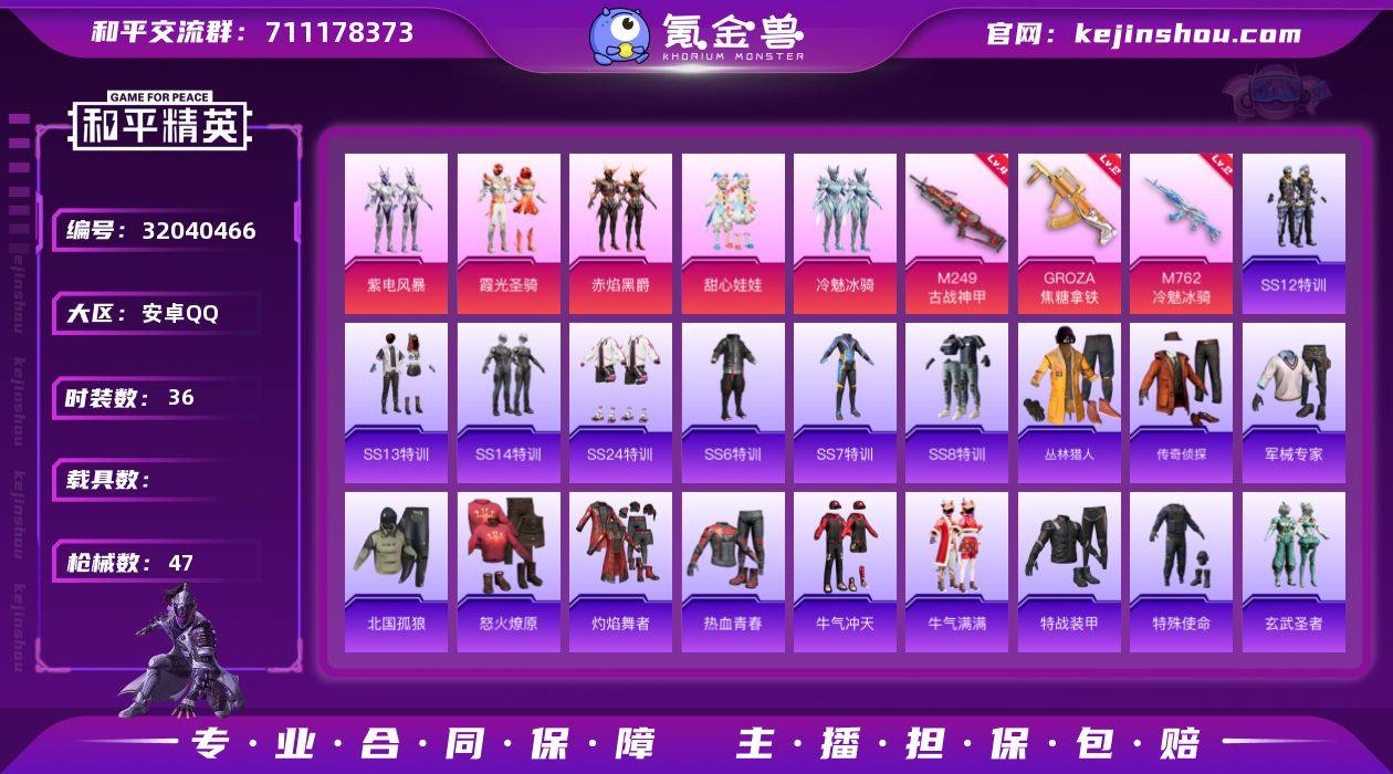 安卓 手Q-5粉装-3特效枪-0载具-16423热力值--2印记-36套装-47枪皮 【特效枪等级】:M249-古战神甲(四级M249-古战神甲),GROZA-焦糖拿铁(二级GROZA-焦糖拿铁),M762-冷魅冰骑(二级M762-冷魅冰骑) 【优质套装】:粉装-紫电风暴,粉装-霞光圣骑,粉装-赤焰黑爵,粉装-甜心娃娃 【稀有套装】:粉装-冷魅冰骑 【优质武器皮肤】:GROZA-焦糖拿铁,M249-古战神甲,M762-冷魅冰骑 【稀有武器皮肤】:AKM-霓虹街区,AKM-龙的传人,AUG-耀粉歌者,DBS-第五大道,G36C-冷魅冰骑,GROZA-马卡龙,Kar98K-彩虹符号,Kar98K-红色方程式,M16A4-蓝色火焰,M249-冷魅冰骑,M249-破晓战魂,M416-蓝色火焰,M762-牛气冲天,M762-第五大道,MG3-甜心娃娃,MG3-第五大道,Mini14-炫彩节奏,Mini14-马卡龙,QBU-锦绣火鲤,S12K-焦糖拿铁,S1897-神秘黑猫,S686-魔法学院,SCAR-L-甜蜜誓约,SCAR-L-红色方程式,UMP45-生命誓言,UZI-红色方程式,Vector-生命誓言,VSS-华贵君王,汤姆逊-天降萌叽,汤姆逊-耀粉歌者 【其他套装】:套装-SS12特训,套装-SS13特训,套装-SS14特训,套装-SS24特训,套装-SS6特训,套装-SS7特训,套装-SS8特训,套装-丛林猎人,套装-传奇侦探,套装-军械专家,套装-北国孤狼,套装-怒火燎原,套装-灼焰舞者,套装-热血青春,套装-牛气冲天,套装-牛气满满,套装-特战装甲,套装-特殊使命,套装-玄武圣者,套装-竞技勇士朋克,套装-荧惑魅影,套装-莱茵河畔,套装-蓝色守护者,套装-跃动心情,套装-酷萌兔限定,套装-霓虹街区,套装-飞行日记,套装-骑行爱好者,套装-鹤鸣,套装-黑色伏地魔,套装-龙的传人 【优质飞行器】:圣光天使飞行器 【优质降落伞】:马卡龙降落伞,第五大道降落伞,焦糖拿铁降落伞,古战神甲降落伞 【稀有头盔】:九霄头盔(2级),甜蜜誓约头盔(3级),马卡龙头盔(2级) 【营地ID】:...