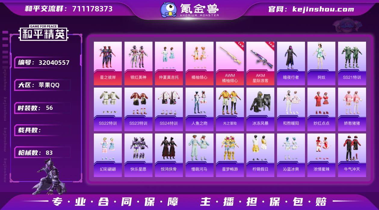 苹果 手Q-4粉装-2特效枪-0载具-25307热力值-0印记-56套装-83枪皮 【0红装】 【4粉装】 粉装-星之彼岸 粉装-橘柚倾心 粉装-银红美神 粉装-仲夏莫吉托 【2特效枪】 AKM-星际浪客 AWM-橘柚倾心 【0载具】 【56套装】 套装-黑色伏地魔 套装-竞技名士 套装-酒红色名流 套装-猛禽 套装-长空猛禽 套装-特殊使命 套装-冰冻风暴 套装-街头潮人 套装-魅力单车 套装-缤纷果语 套装-龙魂突击队 套装-麻辣教官 套装-玲珑飞花 套装-精神漫游 套装-鹤鸣 套装-白熊同盟 套装-萌黄之夏 套装-人鱼之吻 套装-牛气满满 套装-牛气冲天 套装-飞行日记 套装-星之彼岸 套装-快乐星愿 套装-星梦畅游 套装-橘柚倾心 套装-沁蓝冰爽 套装-浓情蜜辣 套装-银红美神 套装-SS21特训 套装-萌趣咩咩 套装-娇憨猪猪 套装-暗夜行者 角色-阿奴 套装-玉兔迎春 套装-SS22特训 套装-和煦暖阳 套装-田园牧歌 套装-轻风白浪 套装-绚烂繁星 套装-光之冒险 套装-绯格组合 套装-SS23特训 套装-仲夏莫吉托 套装-白兰地假日 套装-龙舌兰冰茶 套装-神气柴柴 套装-懵萌河马 套装-妙红点点 套装-幻彩翩翩 套装-王牌教练 套装-柠萌假日 套装-SS24特训 套装-惊鸿侠骨 套装-锦衣飞扬 套装-龙的传人 套装-SS28特训 【2飞行器】 星际浪客飞行器 粉色滑翔尾迹 【0热门】 营地ID:906631206