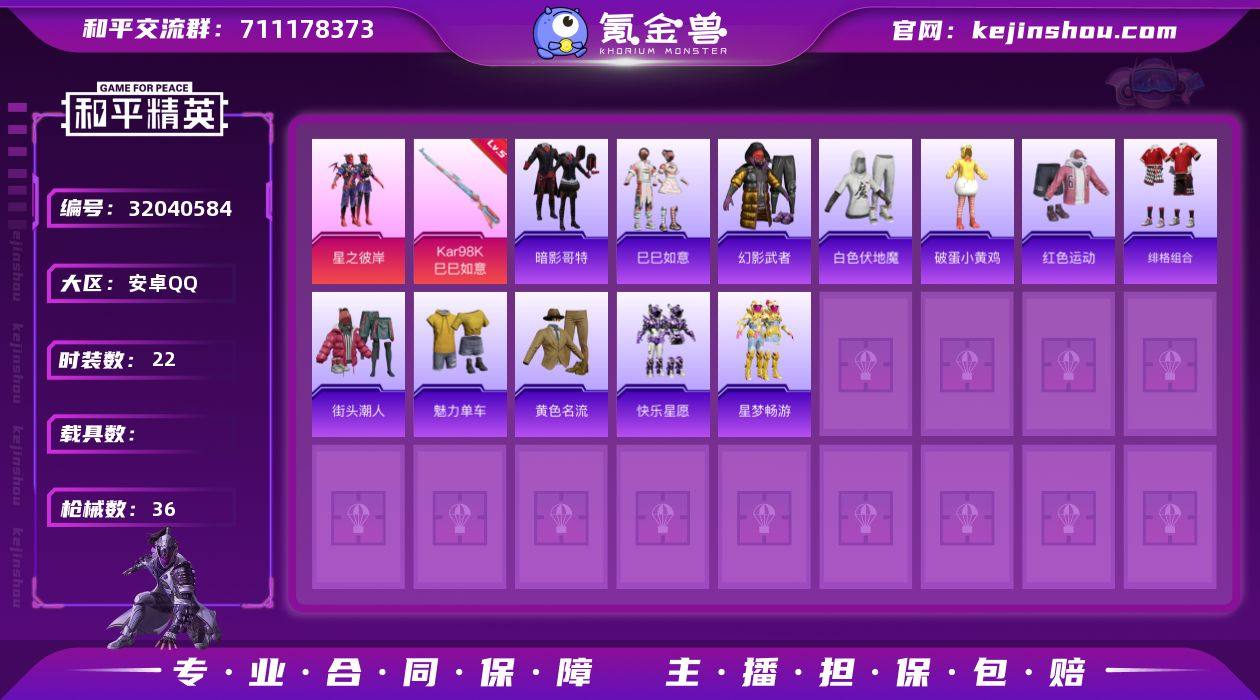 安卓 手Q-1粉装-4特效枪-0载具-1粉色飞行器-9583热力值-0王牌印记-22套装-36枪皮 【热门品类】:套装-暗影哥特 【粉色套装】:粉装-星之彼岸 【粉色枪皮等级】:ACE32-萌骑漫游(二级),AKS-74U-森灵之息(五级),Kar98K-巳巳如意(五级),Mk14-福马献瑞(五级) 【粉色枪皮】:ACE32-萌骑漫游,AKS-74U-森灵之息,Kar98K-巳巳如意,Mk14-福马献瑞 【粉色飞行器】:星之彼岸飞行器 【粉色降落伞】:星之彼岸降落伞,精灵梦叶罗丽降落伞 【稀有套装】:套装-巳巳如意,套装-马上有钱,套装-雨过天青,套装-红釉青花 【稀有枪皮】:AKM-星之彼岸,AKM-龙的传人,SCAR-L-炫彩节奏,M416-蓝色火焰,AUG-耀粉歌者,AC-VAL-天降萌叽,UZI-炫彩节奏,UMP45-生命誓言,P90-巳巳如意,SKS-炫彩节奏,VSS-星之彼岸,S686-巳巳如意,M249-星之彼岸,MG3-幻世战舞者,破片手榴弹-巳巳如意 【其他套装】:套装-幻影武者,套装-暗影哥特,套装-白色伏地魔,套装-破蛋小黄鸡,套装-红色运动,套装-绯格组合,套装-街头潮人,套装-魅力单车,套装-黄色名流,套装-快乐星愿,套装-星梦畅游 【稀有头盔】:深海小丑鱼头盔(2级) 【营地ID】:1049275728