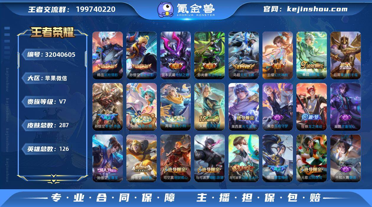 实名: 可修改 性别: 女号 贵族等级: V7 英雄数: 126 皮肤数: 287 荣耀水晶: 全息碎影,弑枪猎影 传说皮: 黄金射手座,末日机甲-孙尚香,零号·赤焰,地狱之眼,无双飞将,幻光神枪,踏浪归 限定皮: 李小龙,梁祝,美猴王,至尊宝,高山流水,孙行者,傲雪梅枪,山海·玄木吟,鸣野蒿 亮点: 【优质装备】:全息碎影(猴子典藏),弑枪猎影(韩信典藏),黄金射手座,末日机甲-孙尚香(绿蚂蚱),零号·赤焰,地狱之眼,无双飞将