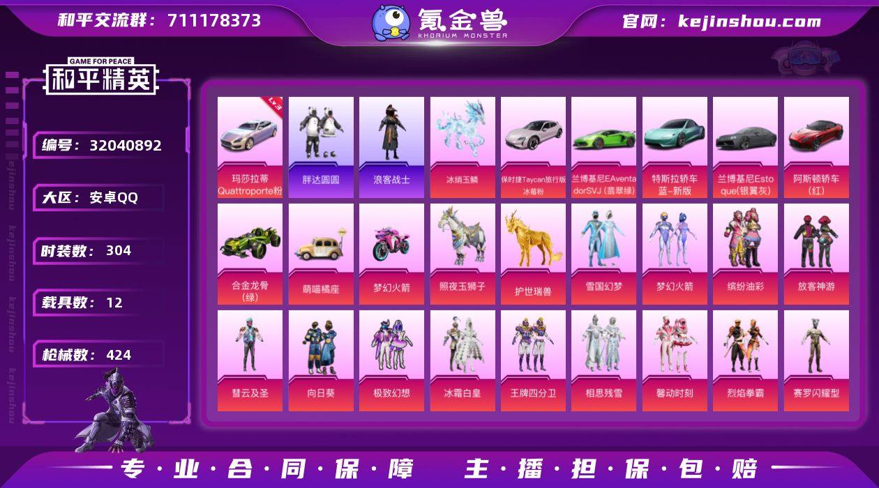 【kyhp860】安卓 手Q-28粉装-26特效枪-12载具-13粉色飞行器-165287热力值-20王牌印记-304套装-424枪皮 【红色载具】:玛莎拉蒂Quattroporte(幻星粉)(三级) 【热门品类】:粉装-雪国幻梦,粉装-梦幻火箭,粉装-缤纷油彩,套装-浪漫天命,套装-胖达圆圆,套装-暗夜行者,套装-浪客战士,角色-忠真马岱,套装-龟仙人,套装-潮萌小黄鸭,套装-浪漫波比,大砍刀-青龙偃月刀,撬棍-龙胆亮银枪 【粉色套装】:粉装-雪国幻梦,粉装-梦幻火箭,粉装-缤纷油彩,粉装-放客神游,粉装-彗云及圣,粉装-向日葵,粉装-极致幻想,粉装-冰霜白皇,粉装-王牌四分卫,粉装-相思残雪,粉装-馨动时刻,粉装-烈焰拳霸,角色-赛罗闪耀型,粉装-林间仙鹿,粉装-彩虹鹿灵,粉装-山涧鹿灵,粉装-齐天大圣,角色-洛天依,粉装-沙场疾风,粉装-吟月归客,粉装-冰川幽秘,粉装-冰川红玫,粉装-海螺星光,粉装-第五大道,粉装-炫光之旅,角色-千金淑猫,角色-月影灵韵,角色-罪夜之冕 【粉色枪皮等级】:AKM-梦之光华(五级),AKM-暮色玫影(三级),SCAR-L-锦绣绵绵(五级),SCAR-L-金蛇镇世(三级),M416-五爪金龙(一级),M416-心之恋语(七级),M416-风花雪月(一级),AUG-星之彼岸(三级),M762-甜蜜誓约(五级),UMP45-萌骑冒险(三级),AKS-74U-森灵之息(四级),P90-沙丘之主(一级),P90-魔童闹海 敖丙(三级),Kar98K-伏魔团(四级),Kar98K-巳巳如意(五级),M24-翩跹演武(四级),Mk14-福马献瑞(五级),AMR-智耀战神(五级),M417-第五大道(五级),DP-28-豹影疾电(五级),MG3-酷泡奶龙(五级),MG-36-沧焰双生(五级),平底锅-林间仙鹿(五级),平底锅-喜羊羊与灰太狼(二级) 【粉色载具】:玛莎拉蒂Quattroporte(幻星粉),特斯拉Roadster(水滴蓝),兰博基尼Aventador SVJ(翡翠绿),兰博基尼Estoque(银翼灰),阿斯顿马丁DBS(红),保时捷Taycan...