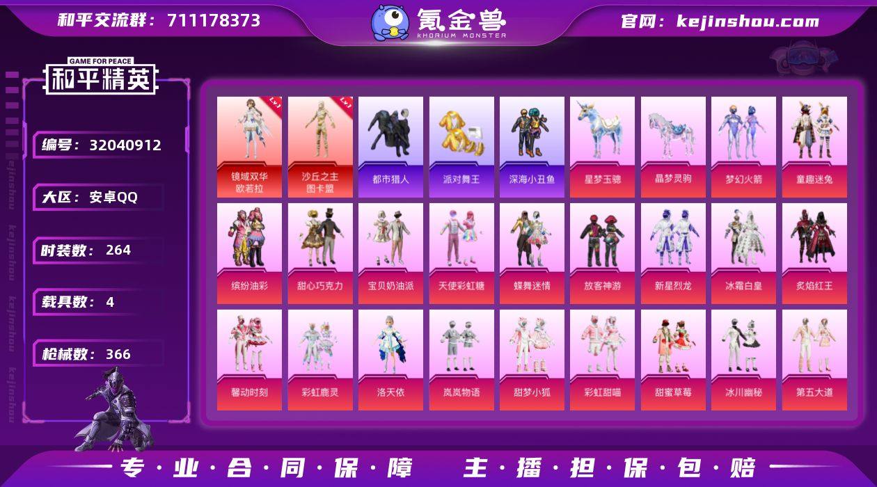 【kyhp852】安卓 手Q-3神装-39粉装-26特效枪-4载具-27粉色飞行器-143512热力值-16王牌印记-264套装-366枪皮 【红色神装等级】:暮色玫影-艾丽娅(五级),镜域双华-欧若拉(一级),沙丘之主-图卡盟(一级) 【红色角色神装】:暮色玫影-艾丽娅,镜域双华-欧若拉,沙丘之主-图卡盟 【热门品类】:粉装-梦幻火箭,粉装-童趣迷兔,粉装-缤纷油彩,套装-都市猎人,套装-派对舞王,套装-深海小丑鱼,套装-龟仙人,套装-粉红小猪 【粉色套装】:粉装-甜心巧克力,粉装-宝贝奶油派,粉装-天使彩虹糖,粉装-蝶舞迷情,粉装-梦幻火箭,粉装-缤纷油彩,粉装-放客神游,粉装-新星烈龙,粉装-冰霜白皇,粉装-童趣迷兔,粉装-炙焰红王,粉装-馨动时刻,粉装-彩虹鹿灵,角色-洛天依,粉装-岚岚物语,粉装-甜梦小狐,粉装-彩虹甜喵,粉装-甜蜜草莓,粉装-冰川幽秘,粉装-第五大道,角色-小可学妹,粉装-未来歌姬,粉装-蜜语绒猫,角色-美琪,角色-守护天翼,角色-初号机 觉醒Ver.,粉装-金丰海韵,角色-千金淑猫,角色-樱桃泡泡,粉装-雪月幻音,角色-智耀战神,粉装-幻彩电音,角色-狂魅哈莉,角色-荧海星豚,角色-奇迹舞步 贝贝,角色-奇迹舞步 美琪,角色-奇迹舞步 美雪,角色-霁蓝缠春,角色-虹云熊熊 【粉色枪皮等级】:AKM-幽焰骑士(三级),SCAR-L-青春物语(七级),SCAR-L-锦绣绵绵(五级),SCAR-L-金蛇镇世(一级),SCAR-L-灵驹仙姬(三级),M416-电玩时刻(五级),M416-墨龙九天(三级),GROZA-精灵之光(三级),蜜獾-荧海星豚(五级),UMP45-恐龙拽拽(七级),Vector-最终圣卫者(三级),汤姆逊-星月云朵(二级MK12-雪月幻音),AKS-74U-信仰神谕(四级),P90-沙丘之主(三级),Kar98K-巳巳如意(五级),Mk14-樱桃泡泡(四级),Mk14-辉云木星(一级),Mk14-福马献瑞(五级),M417-第五大道(一级),SPAS-12-蜜语绒猫(四级),M249-彩虹甜喵(四级)...