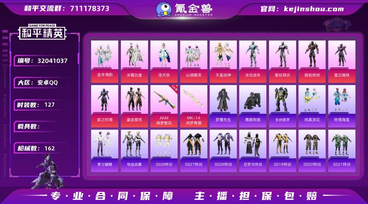 安卓 手Q-11粉装-2特效枪-0载具-50498热力值-5印记-127套装-162枪皮 【特效枪等级】:AKM-绿萝繁花(五级AKM-绿萝繁花) 【优质套装】:粉装-金丰海韵,粉装-冰霜白皇,角色-洛天依,粉装-山涧鹿灵,粉装-天星战神,角色-冰炎战车,角色-紫钛骑兵,角色-熔岩统帅,角色-星云暗核,角色-宙之时溯,粉装-鎏金朋克 【优质武器皮肤】:AKM-绿萝繁花,Mk14-闲梦青缨 【稀有武器皮肤】:DBS-焰鹰斗篷,AWM-焰鹰斗篷,DP-28-焰鹰斗篷,Vector-焰鹰斗篷,AC-VAL-天降萌叽,AC-VAL-快闪甜心,AKM-影袭,AKM-春暖花开,AKM-灼热熔岩,AKM-破晓战魂,AKM-霓虹街区,AKM-龙的传人,AMR-妙红点点,AUG-天降萌叽,AUG-耀粉歌者,AWM-圣堂之誓,AWM-垂柳戏鸭,DBS-圣堂之誓,DBS-黑白懵懵牛,G36C-懵萌河马,GROZA-影袭,GROZA-懵萌河马,GROZA-紫翼圣骑,Kar98K-影袭,Kar98K-梦幻火箭,Kar98K-炫彩节奏,Kar98K-王子的夏天,Kar98K-红色方程式,Kar98K-飞驰魅影,M16A4-幻世战舞者,M16A4-红色方程式,M200-惊鸿侠骨,M24-影袭,M24-炫彩节奏,M249-妙红点点,M249-彩虹符号,M249-破晓战魂,M416-彩虹嘻嘻猴,M416-摩登王国,M416-糯团青竹,M416-红色方程式,M417-惊鸿侠骨,M762-绯红前夜,MG3-妙红点点,MG3-幻世战舞者,MG3-惊鸿侠骨,MG3-第五大道,Mini14-梦幻火箭,Mini14-炫彩节奏,Mini14-熔岩统帅,Mini14-穿刺龙虾,Mini14-筑梦精灵,Mini14-耀粉歌者,Mk14-童趣迷兔,MK20-H-快闪甜心,Mk47-妙红点点,P18C-熔岩统帅,P90-倾城蜜语,P90-快闪甜心,P90-飞驰魅影,PKM-懵萌河马,QBZ-彩虹符号,QBZ-飞驰魅影,R1895-六号树人,S12K-垂柳戏鸭,S12K-娇憨猪猪,S12K-幻世战舞者,S12K-破晓战魂,S12K-童趣迷兔,S1897-炫彩节奏,S1897-飞驰魅影,S686-生命誓言,SCAR-L-炫彩节奏,SCAR-L-玉兔迎春,SCAR-L-红色方程式,...