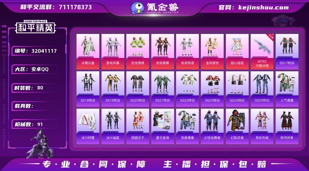 安卓 手Q-7粉装-1特效枪-0载具-28260热力值-0印记-80套装-91枪皮 【特效枪等级】:M762-冷魅冰骑(五级M762-冷魅冰骑) 【优质套装】:粉装-冰霜白皇,粉装-紫电风暴,粉装-恐龙拽拽,粉装-赤焰黑爵,粉装-岚岚物语,粉装-金风银杏,粉装-甜心娃娃 【优质武器皮肤】:M762-冷魅冰骑 【稀有武器皮肤】:AKM-彩虹符号,AKM-破晓战魂,AKM-虎虎生威,AKM-霓虹街区,M16A4-蓝色火焰,SCAR-L-玉兔迎春,SCAR-L-红色方程式,SCAR-L-龙宫之主,M416-红色方程式,M416-绯红前夜,M416-蓝色火焰,GROZA-异彩先驱,GROZA-彩虹符号,GROZA-恐龙拽拽,GROZA-懵萌河马,GROZA-紫翼圣骑,GROZA-蓝莓炮弹,AUG-耀粉歌者,QBZ-电玩视界,QBZ-神秘黑猫,QBZ-飞驰魅影,M762-天降萌叽,M762-瑞龙福将,M762-绯红前夜,M762-风花雪月,Mk47-天之羽翼,G36C-冷魅冰骑,G36C-懵萌河马,蜜獾-天降萌叽,UZI-炫彩节奏,UZI-红色方程式,UMP45-春暖花开,UMP45-涂山之恋,UMP45-灵符少年,UMP45-生命誓言,UMP45-蓝色火焰,Vector-暗夜玫瑰,Vector-百合蜜语,汤姆逊-天降萌叽,汤姆逊-异彩先驱,MP5K-异彩先驱,P90-飞驰魅影,Kar98K-炫彩节奏,Kar98K-飞驰魅影,M24-百合蜜语,AWM-不夜海上花,VSS-彩虹符号,Mini14-异彩先驱,Mini14-春暖花开,Mini14-梦幻火箭,Mk14-暗星紫秘,Win94-瑞龙福将,SLR-彩虹符号,莫辛纳甘-懵萌河马,莫辛纳甘-炙焰牛王,M417-惊鸿侠骨,M200-惊鸿侠骨,S686-生命誓言,S686-红色方程式,S1897-飞驰魅影,S12K-瑞龙福将,S12K-龙宫之主,S12K-幻世战舞者,M249-冷魅冰骑,DP-28-彩虹符号,DP-28-紫翼圣骑,MG3-幻世战舞者,MG3-惊鸿侠骨,MG3-瑞龙福将,MG3-甜心娃娃,PKM-懵萌河马,沙漠之鹰-王牌投手,爆炸猎弓-天星战神,爆炸猎弓-惊鸿侠骨 【其他套装】:套装-SS17特训,套装-SS18特训,套装-SS19特训,...