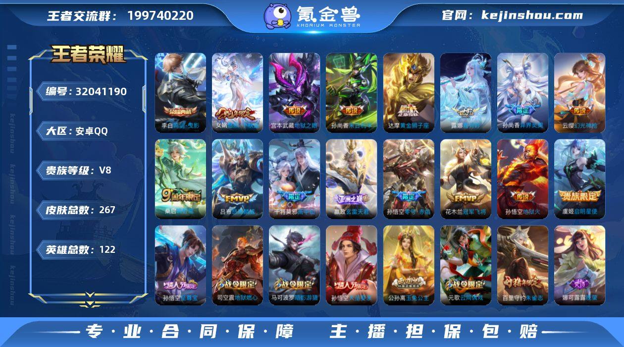 【v8极品打野号 至尊宝霜月吟 267皮肤15传说】安卓Q-V8-最强王者段位-122英雄-267皮肤-1典藏-0珍品无双-0无双-0珍品传说-15传说-98史诗 【英雄全皮】:影全皮 【荣耀典藏】:李白鸣剑曳影 【传说皮肤】:女娲愿照千秋盛,云缨幻光神枪,嬴政玄雷天君,桑启鸣野蒿,露娜霜月吟,干将莫邪画中仙,吕布怒海麟威,孙尚香异界灵契,虞姬启明星使,孙悟空零号赤焰,达摩黄金狮子座,花木兰冠军飞将,孙尚香末日机甲,宫本武藏地狱之眼,孙悟空地狱火 【限定皮肤】:狄仁杰阴阳师,赵云皇家上将,墨子神迹守卫,墨子降魔,嬴政优雅恋人,孙尚香异界灵契,庄周高山流水,阿轲迷踪丽影,钟无艳超时空战士,扁鹊奇幻香踪,白起夜都怪侠,芈月重明,芈月幻夜卜梦,元歌云间偶戏,元歌无心,夏侯惇朔风刀,甄姬游园惊梦,甄姬落雪兰心,曹操烛龙,典韦穷奇,马可波罗暗影游猎,狄仁杰魔术师,狄仁杰万华元夜,达摩星际陆战队,达摩沙漠行僧,项羽海滩派对,老夫子醍醐杖,老夫子航海奇遇记,程咬金演武夺筹,刘邦夺宝奇兵,王昭君午后时光,兰陵王金庭之子,亚瑟潮玩骑士王,孙悟空至尊宝,孙悟空大圣娶亲,孙悟空零号赤焰,牛魔御旌,后羿圣弓游侠,李元芳云中旅人,虞姬启明星使,钟馗驱傩正仪,杨玉环遇见飞天,杨戬潮玩骑兵,干将莫邪真爱魔法,干将莫邪画中仙,雅典娜单词大作战,雅典娜黎明之约,鬼谷子原初探秘者,鬼谷子五谷丰年,黄忠火炮绅士,苏烈千军破阵,百里玄策原初追逐者,百里守约朱雀志,弈星混沌棋,梦奇顽趣,公孙离玉兔公主,沈梦溪大漠名商,明世隐疑决卦,明世隐吟游魔法,裴擒虎李小龙,裴擒虎擒涛扼浪,狂铁御狮,狂铁电玩高手,米莱狄御霄,米莱狄胡桃异想国,盾山御銮,猪八戒西部大镖客,嫦娥拒霜思,嫦娥暖冬兔眠,西施玲珑珍味,蒙犽狂想玩偶喵,鲁班大师探海日志,桑启海盐诗旅,暃星界游侠,...