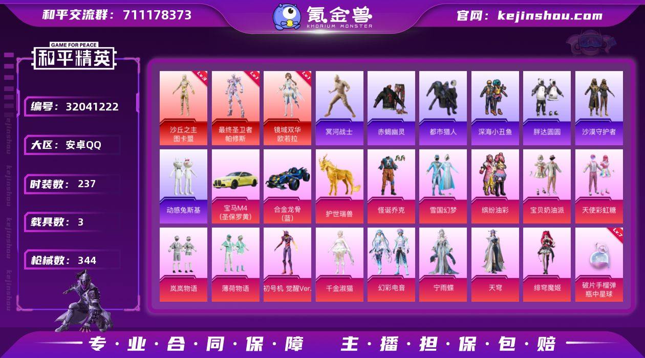 安卓 手Q-3神装-13粉装-20特效枪-3载具-9粉色飞行器-113146热力值-18王牌印记-237套装-344枪皮 【红色神装等级】:最终圣卫者-帕修斯(一级),镜域双华-欧若拉(一级),沙丘之主-图卡盟(三级) 【红色角色神装】:最终圣卫者-帕修斯,镜域双华-欧若拉,沙丘之主-图卡盟 【热门品类】:粉装-怪诞乔克,粉装-雪国幻梦,粉装-缤纷油彩,套装-浪漫天命,套装-赤蝎幽灵,套装-都市猎人,套装-冥河战士,套装-深海小丑鱼,角色-军刀雅典娜,套装-胖达圆圆,套装-沙漠守护者,套装-动感兔斯基人偶服,套装-龟仙人,套装-潮萌小黄鸭,套装-暗影哥特,套装-浪漫波比,套装-糯粉咩咩,角色-8号机,角色-Mark.06,角色-六号稻草人,熔岩游骑兵连帽夹克,套装-红熊茄茄 【粉色套装】:粉装-怪诞乔克,粉装-宝贝奶油派,粉装-天使彩虹糖,粉装-雪国幻梦,粉装-缤纷油彩,粉装-岚岚物语,粉装-薄荷物语,角色-初号机 觉醒Ver.,角色-千金淑猫,粉装-幻彩电音,角色-宁雨蝶,角色-天穹,角色-绯穹魔姬 【粉色枪皮等级】:AKM-炫紫旋律(五级),AKM-绿萝繁花(五级),SCAR-L-锦绣绵绵(五级),SCAR-L-金蛇镇世(三级),M416-电玩时刻(五级),M416-墨龙九天(三级),GROZA-镜光银凌(五级),AUG-暖羊咩咩(五级),M762-青锋波束(五级),UMP45-量子极限(五级),Vector-最终圣卫者(三级),汤姆逊-热量炸弹(五级),P90-沙丘之主(三级),Kar98K-巳巳如意(五级),M24-镜域双华(三级),Mk14-甜梦熊击(五级),Mk14-福马献瑞(一级),DP-28-豹影疾电(五级),MG-36-幻彩电音(二级),破片手榴弹-瓶中星球(七级) 【粉色载具】:宝马M4(圣保罗黄),合金龙骨(蓝),护世瑞兽 【粉色枪皮】:AKM-炫紫旋律,AKM-绿萝繁花,SCAR-L-锦绣绵绵,SCAR-L-金蛇镇世,M416-电玩时刻,M416-墨龙九天,GROZA-镜光银凌,AUG-暖羊咩咩,M762-青锋波束,UMP45-量子极限,...