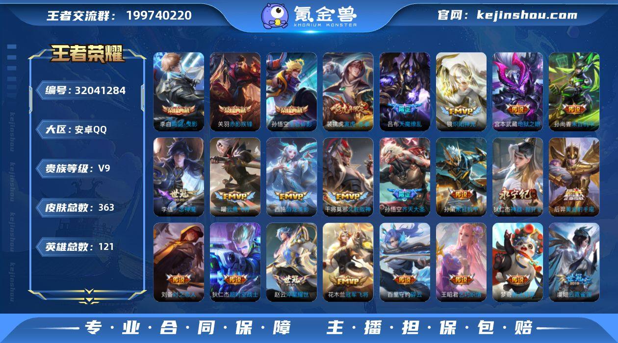 【363皮3典藏25传说V9】安卓Q-V9-121英雄-363皮肤-3典藏-0无双-0珍品传说-25传说-108史诗,印记17,银标7,铜标15,发育路31段,游走30段,金虎啸春天幕,星传说2:未来机甲、星际治安官,v9 【荣耀典藏】:孙悟空全息碎影,李白鸣剑曳影,关羽赤影疾锋 【内测皮肤】:孙尚香蔷薇恋人,艾琳女武神,狂铁特工战影 【传说皮肤】:赵云淬星耀世,吕布天魔缭乱,周瑜音你心动,宫本武藏地狱之眼,狄仁杰超时空战士,狄仁杰神器狴犴令,花木兰冠军飞将,张良黄金白羊座,孙悟空齐天大圣,后羿黄金射手座,后羿无尽星芒,刘备时之恋人,虞姬云霓雀翎,虞姬启明星使,干将莫邪久胜战神,铠绛天战甲,百里守约碎云,梦奇胖达荣荣,裴擒虎寅虎赤拳,李信一念神魔,孙策末日机甲,曜云鹰飞将,西施游龙清影,镜炽阳神光,王昭君乞巧织情 【限定皮肤】:姜子牙天穹之誓,狄仁杰阴阳师,赵云皇家上将,墨子神迹守卫,嬴政白昼王子,孙尚香蔷薇恋人,鲁班七号狮舞东方,庄周高山流水,阿轲迷踪丽影,钟无艳王者之锤,钟无艳超时空战士,扁鹊奇幻香踪,白起夜都怪侠,芈月重明,芈月幻夜卜梦,吕布天魔缭乱,吕布猎兽之王,周瑜赤莲之焰,元歌云间偶戏,元歌无心,夏侯惇朔风刀,甄姬游园惊梦,甄姬落雪兰心,曹操烛龙,典韦穷奇,典韦蓝屏警告,马可波罗暗影游猎,马可波罗山海玄木吟,狄仁杰魔术师,狄仁杰万华元夜,狄仁杰神器狴犴令,达摩星际陆战队,达摩沙漠行僧,项羽海滩派对,老夫子醍醐杖,老夫子航海奇遇记,关羽冰锋战神,程咬金演武夺筹,刘邦夺宝奇兵,韩信逐梦之影,韩信傲雪梅枪,王昭君午后时光,兰陵王驯魔猎人,兰陵王金庭之子,亚瑟潮玩骑士王,孙悟空至尊宝,孙悟空大圣娶亲,孙悟空孙行者,孙悟空齐天大圣,牛魔御旌,后羿辉光之辰,后羿如梦令,后羿圣弓游侠,后羿无尽星芒,李元芳银河之约,李元芳云中...