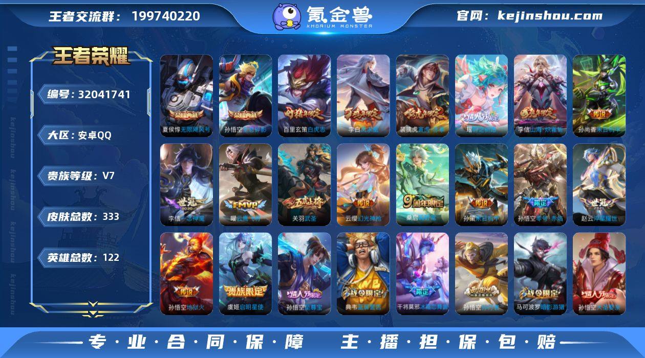 【333皮2典藏 全息碎影 无限飓风 白虎志 云鹰飞将 时之祈愿 祈雪灵祝 一念神魔】:安卓Q-V7-至尊星耀I段位-122英雄-333皮肤-2典藏-0无双-0珍品传说-15传说-100史诗 【荣耀典藏】:孙悟空全息碎影,夏侯惇无限飓风号 【内测皮肤】:嬴政优雅恋人,艾琳女武神,狂铁特工战影 【传说皮肤】:赵云淬星耀世,关羽武圣,孙悟空地狱火,孙悟空零号赤焰,虞姬启明星使,百里玄策白虎志,裴擒虎寅虎赤拳,瑶时之祈愿,李信一念神魔,李信山海炽霜斩,孙策末日机甲,曜云鹰飞将,桑启鸣野蒿,云缨幻光神枪 【限定皮肤】:白起狰,姜子牙天穹之誓,狄仁杰阴阳师,虞姬凯尔特女王,赵云皇家上将,赵云引擎之心,赵云龙胆,赵云百木心枪,墨子神迹守卫,嬴政优雅恋人,嬴政白昼王子,鲁班七号狮舞东方,庄周高山流水,阿轲迷踪丽影,钟无艳超时空战士,孙膑妖精王,扁鹊炼金王,白起夜都怪侠,芈月重明,芈月白晶晶,芈月幻夜卜梦,吕布猎兽之王,吕布御风骁将,周瑜赤莲之焰,元歌云间偶戏,元歌无心,夏侯惇朔风刀,甄姬落雪兰心,曹操烛龙,典韦穷奇,典韦蓝屏警告,马可波罗暗影游猎,狄仁杰魔术师,狄仁杰万华元夜,达摩星际陆战队,达摩沙漠行僧,项羽海滩派对,老夫子醍醐杖,老夫子航海奇遇记,关羽武圣,程咬金演武夺筹,刘邦夺宝奇兵,韩信逐梦之影,韩信飞衡,韩信傲雪梅枪,王昭君午后时光,兰陵王驯魔猎人,兰陵王金庭之子,花木兰默契交锋,亚瑟潮玩骑士王,孙悟空至尊宝,孙悟空大圣娶亲,孙悟空零号赤焰,孙悟空孙行者,牛魔御旌,后羿圣弓游侠,李元芳银河之约,李元芳云中旅人,虞姬启明星使,钟馗神迹守卫,钟馗驱傩正仪,女娲朔望之晖,干将莫邪冰霜恋舞曲,干将莫邪真爱魔法,雅典娜单词大作战,雅典娜黎明之约,太乙真人饕餮,东皇太一逐梦之光,鬼谷子原初探秘者,黄忠火炮绅士,苏烈千军破阵,百里玄策...