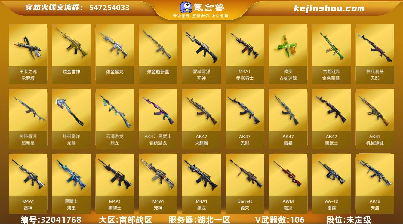 湖北一区-112V-7王者-3炫金 【传说角色】:传说星骇 【热门武器】:QBZ03-金色蔷薇,金色蔷薇-古蛇迷踪,修罗-古蛇迷踪,M200-竞技荣光,死亡之眼,M4A1-黑骑士*2,汤姆逊-烈龙*5,RPK-盘龙*3,加特林-炼狱,斯泰尔-蝴蝶,USP-雷暴*2,沙鹰-修罗*5 【王者炫金武器】:王者青龙,炫金黑龙,炫金雷神,炫金超新星 【音效卡】:M4A1-黑骑士音效卡,Barrett-毁灭音效卡,AWM-裁决音效卡,炼狱-百战金芒-庆典舞曲音效卡,死神-雪域霜狐-怀旧音效卡 【皮肤】:幻神-电竞之星 皮肤,金色蔷薇-电竞之星 皮肤,裁决-流光秘银,AWM-裁决-凤灵皮肤,裁决-羽掣 皮肤,雷神-暗月,雷神-能量核心*2,雷神-星空,雷神-宇航兔皮肤,雷神-维纳斯皮肤,雷神-源计划2.0专属 皮肤,雷神-诺拉 皮肤,M4A1-再燃火线,雷神-神秘按键 皮肤,火麒麟-AG战队皮肤,火麒麟-斗鱼平台皮肤,火麒麟-百城*2,火麒麟-心动糖果,毁灭-暗月,毁灭-星空,毁灭-黑大圣皮肤,毁灭-虹光风暴 皮肤,毁灭-英雄计划 皮肤,M4A1-千变-孔明皮肤*2,黑龙-能量核心,黑龙-暗月,M4A1-黑骑士-娜塔莉娅 皮肤,无影-能量核心,死神-秘银*2,战神-粉色甜心皮肤,战神-紫绶金章皮肤*4,战神-流金岁月皮肤*3,炼狱-玩具枪皮肤,炼狱-月 皮肤,修罗-能量核心,天神-暗月*3,天神-宇航兔皮肤,屠龙-春桃 皮肤*2,屠龙-惊鸿 皮肤,轻型军用手斧-再燃火线,龙啸-青青莓果 皮肤,麒麟刺-萌杀皮肤,麒麟刺-月皮肤 【角色】:葵,樱,电竞教官-云悠悠,战地猎狐,王者春,王者影豹,雪域霜狐,蛇隐宗,奇洋探员,乔伊教练,修道士,云海玲珑,空,北极狐-X,初恋灵狐,芳心审判者,飞虎队-X,风暴女,虎妞,嘉年华灵狐,兰-海滩派对,兰-新年限定,猎狐者-追月,零-水下丽影,灵狐-花神,灵狐者-黄金海岸,灵狐者-七夕宝贝,龙儿,龙儿-小淘气,麻雀,曼陀罗-礼服,玫瑰花神,...