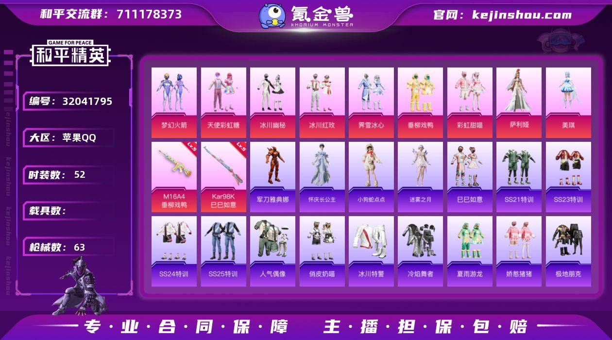苹果 手Q-9粉装-2特效枪-0载具-21134热力值-0印记-52套装-63枪皮 【特效枪等级】:M16A4-垂柳戏鸭(五级M16A4-垂柳戏鸭),Kar98K-巳巳如意(五级Kar98K-巳巳如意) 【优质套装】:粉装-梦幻火箭,粉装-天使彩虹糖,粉装-冰川幽秘,粉装-冰川红玫,粉装-霁雪冰心,粉装-垂柳戏鸭,粉装-彩虹甜喵,角色-萨利娅 【稀有套装】:角色-美琪,角色-怀庆长公主,玩偶服-小狗蛇点点,套装-迷雾之月,套装-巳巳如意 【优质武器皮肤】:M16A4-垂柳戏鸭,Kar98K-梦幻火箭,Kar98K-巳巳如意 【稀有武器皮肤】:M16A4-甜心亚梦,SCAR-L-玉兔迎春,SCAR-L-甜蜜旋律,SCAR-L-小狗蛇点点,M416-红色方程式,GROZA-懵萌河马,AUG-耀粉歌者,QBZ-银碳小老虎,M762-彩虹甜喵,G36C-懵萌河马,AC-VAL-天降萌叽,AC-VAL-彩虹甜喵,AC-VAL-甜心亚梦,蜜獾-垂柳戏鸭,蜜獾-娇憨猪猪,UZI-娇憨猪猪,UZI-幻影战神,UMP45-仲夏莫吉托,UMP45-夜灯,UMP45-生命誓言,Vector-暗夜玫瑰,MP5K-飒粉甜心,AKS-74U-鬼刀,P90-巳巳如意,Kar98K-彩虹符号,Kar98K-梦幻火箭,AWM-垂柳戏鸭,SKS-炫彩节奏,Mini14-梦幻火箭,SLR-娇憨猪猪,M417-绒雪飘舞,S686-巳巳如意,S1897-炫彩节奏,S12K-冰川粉黛,S12K-垂柳戏鸭,S12K-娇憨猪猪,S12K-幻影战神,DBS-彩虹甜喵,DBS-甜心亚梦,DBS-月影灵韵,DP-28-甜心亚梦,MG3-幻世战舞者,PKM-小狗蛇点点,P1911-小狗蛇点点,破片手榴弹-巳巳如意 【热门品类】:角色-军刀雅典娜 【其他套装】:套装-SS21特训,套装-SS23特训,套装-SS24特训,套装-SS25特训,套装-人气偶像,套装-俏皮奶喵,套装-冰川特警,套装-冷焰舞者,套装-夏雨游龙,套装-娇憨猪猪,套装-极地朋克,套装-浪漫天命,套装-灵动马戏师,套装-玉兔迎春,套装-甜蜜告白,套装-神气柴柴,套装-竞技名士,套装-竞技达人朋克,套装-红色运动,套...