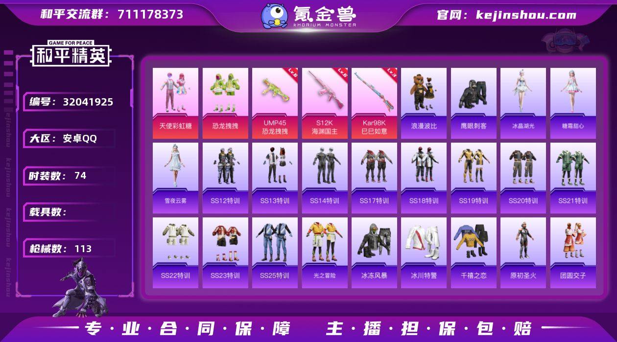 安卓 手Q-2粉装-3特效枪-0载具-32625热力值-0印记-74套装-113枪皮 【特效枪等级】:UMP45-恐龙拽拽(六级UMP45-恐龙拽拽),Kar98K-巳巳如意(三级Kar98K-巳巳如意),S12K-海渊国主(六级S12K-海渊国主) 【优质套装】:粉装-天使彩虹糖,粉装-恐龙拽拽 【稀有套装】:角色-冰晶湖光,角色-糖霜甜心,套装-雪夜云雾 【优质武器皮肤】:SCAR-L-黄金龙骨,UMP45-恐龙拽拽,Kar98K-巳巳如意,S12K-海渊国主 【稀有武器皮肤】:AKM-海渊国主,AKM-灼热熔岩,AKM-生命誓言,AKM-虎虎生威,AKM-龙的传人,AKM-星月云朵,M16A4-幻世战舞者,SCAR-L-炫彩节奏,SCAR-L-玉兔迎春,SCAR-L-黄金龙骨,M416-夜灯,M416-摩登王国,M416-暗星紫秘,M416-糯团青竹,M416-蓝色火焰,GROZA-恐龙拽拽,GROZA-田园牧歌,GROZA-蓝莓炮弹,AUG-天降萌叽,AUG-耀粉歌者,QBZ-原初圣火,QBZ-飞驰魅影,M762-天降萌叽,M762-暖熊萌萌,M762-牛气冲天,M762-瑞龙福将,M762-萌物绒绒,M762-诡娃娃,G36C-暗夜玫瑰,AC-VAL-天降萌叽,蜜獾-垂柳戏鸭,蜜獾-天降萌叽,蜜獾-娇憨猪猪,UZI-娇憨猪猪,UZI-炫彩节奏,UZI-红色方程式,UMP45-海渊国主,UMP45-生命誓言,Vector-彩虹符号,Vector-田园牧歌,Vector-音爆索尼克,汤姆逊-天降萌叽,汤姆逊-耀粉歌者,P90-筑梦精灵,P90-飞驰魅影,Kar98K-彩虹符号,Kar98K-炫彩节奏,Kar98K-飞驰魅影,AWM-不夜海上花,SKS-炫彩节奏,VSS-田园牧歌,Mini14-原初圣火,Mini14-海渊国主,Mini14-炫彩节奏,Mini14-龙宫之主,Win94-瑞龙福将,SLR-四圣焕新,SLR-娇憨猪猪,M417-惊鸿侠骨,MK20-H-樱桃泡泡,M200-惊鸿侠骨,S686-红色方程式,S1897-百万伏特,S1897-碧影闪光,S1897-飞驰魅影,S12K-瑞龙福将,S12K-垂柳戏鸭,S12K-娇憨猪猪,S12K-幻世战舞者,SPAS-12-田园牧歌,M249-月影鸳鸯,M249-破晓战魂...