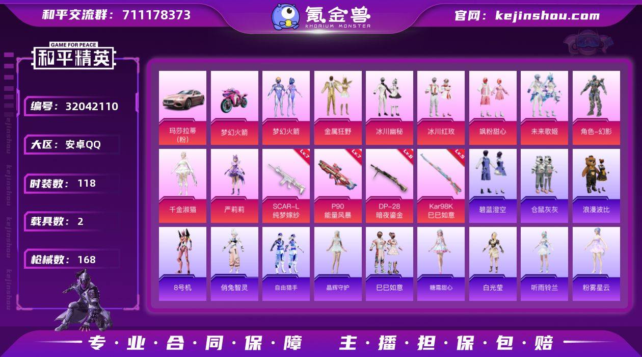 安卓 手Q-10粉装-4特效枪-2载具-53268热力值-8印记-118套装-168枪皮 【稀有载具】:玛莎拉蒂Ghibli(粉),双人摩托-梦幻火箭 【特效枪等级】:SCAR-L-纯梦嫁纱(七级SCAR-L-纯梦嫁纱),P90-能量风暴(七级P90-能量风暴),Kar98K-巳巳如意(五级Kar98K-巳巳如意),DP-28-暗夜鎏金(六级DP-28-暗夜鎏金) 【优质套装】:粉装-梦幻火箭,粉装-金属狂野,粉装-冰川幽秘,粉装-冰川红玫,粉装-飒粉甜心,粉装-未来歌姬,角色-幻影,粉装-碧蓝澄空,角色-千金淑猫 【稀有套装】:角色-严莉莉,角色-8号机,角色-俏兔智灵,套装-自由猎手,套装-晶辉守护,套装-巳巳如意,角色-糖霜甜心 【优质武器皮肤】:SCAR-L-纯梦嫁纱,P90-能量风暴,Kar98K-梦幻火箭,Kar98K-巳巳如意,DP-28-暗夜鎏金 【稀有武器皮肤】:AKM-恐龙拽拽,AKM-破晓战魂,AKM-霓虹街区,SCAR-L-炫彩节奏,M416-神秘黑猫,M416-糯团青竹,M416-红色方程式,M416-绯红前夜,GROZA-恐龙拽拽,GROZA-懵萌河马,GROZA-春暖花开,GROZA-田园牧歌,GROZA-黑色刀锋,AUG-冰川粉黛,AUG-耀粉歌者,QBZ-未来歌姬,M762-天星战神,M762-天降萌叽,M762-彩虹符号,M762-拳皇97,M762-暗夜鎏金,M762-牛气冲天,M762-第五大道,Mk47-妙红点点,G36C-懵萌河马,AC-VAL-天降萌叽,AC-VAL-彩虹甜喵,AC-VAL-快闪甜心,蜜獾-天降萌叽,蜜獾-娇憨猪猪,UZI-啾咪啾咪,UZI-天降萌叽,UZI-娇憨猪猪,UZI-金风玉露,UMP45-涂山之恋,Vector-彩虹符号,Vector-田园牧歌,Vector-黑色刀锋,汤姆逊-勇闯险境,汤姆逊-暗夜鎏金,汤姆逊-耀粉歌者,汤姆逊-花间之火,汤姆逊-银刃赛罗,MP5K-飒粉甜心,MP5K-自由猎手,P90-快闪甜心,P90-巳巳如意,Kar98K-2B战斗服款,Kar98K-勇闯险境,Kar98K-古堡领主,Kar98K-梦幻火箭,M24-冰封烈焰,AWM-不夜海上花,SKS-勇闯险境,SKS-夜灯,SKS...