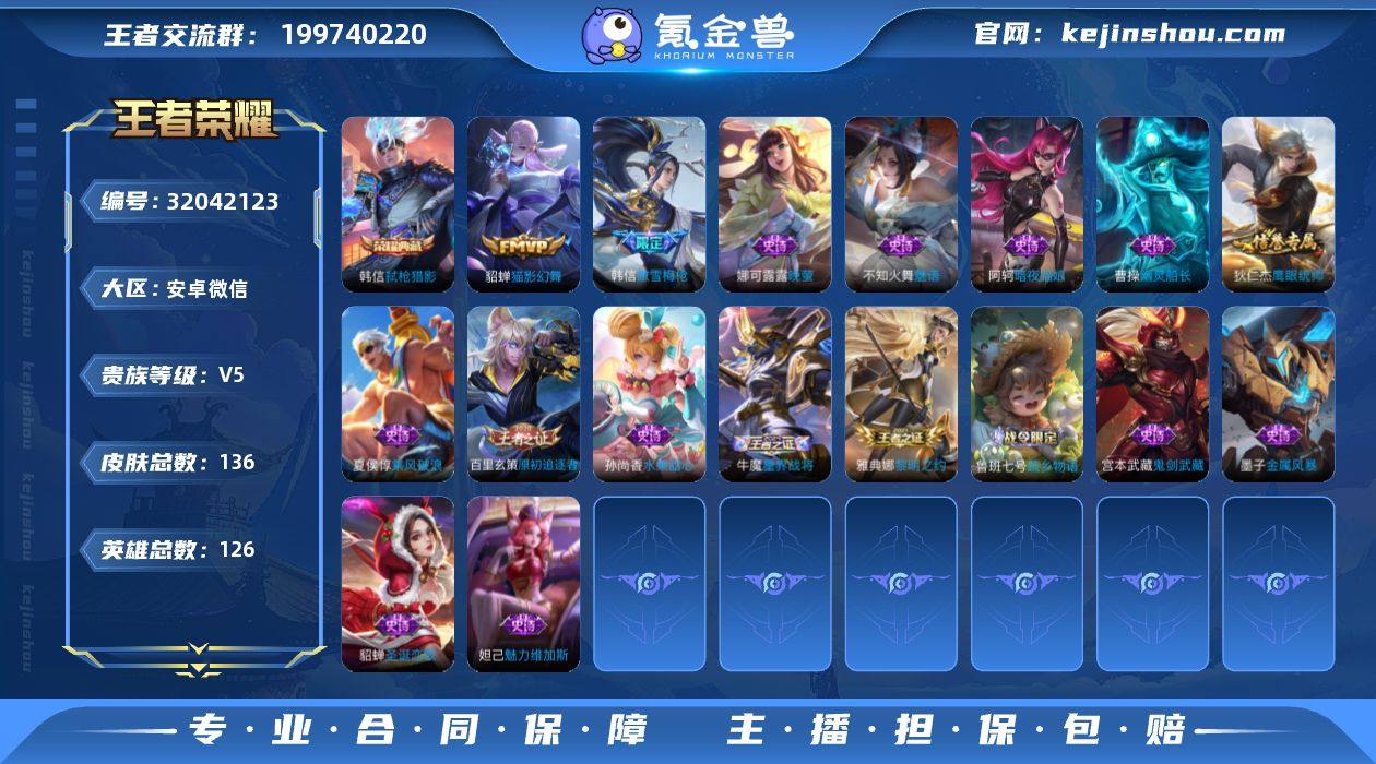 V5 1典藏 1传说 126英雄 136皮肤 可修改实名 男号 有社交场景限制 【英雄全皮】大禹全皮 【稀有英雄】大司命,韩信(韩跳跳),夏洛特(夏师傅),艾琳,橘右京(橘子),娜可露露(鸟人),不知火舞,赵云,金蝉(唐僧),戈娅 【荣耀水晶】弑枪猎影(韩信典藏) 【传说皮】猫影幻舞 【珍宝阁皮】蔷薇恋人,玩趣恶龙 【赛季/战令皮】噬灭天穹(s37),古海寻踪(s33),海盐诗旅(s30),擒涛扼浪(s31),探海日志(s32),顽趣-梦奇,剑破天穹(s35),天穹祈灯(s34),天穹之誓(s36),驱傩正仪(s24),千军破阵(s25),沙漠行僧(s26),金庭之子(s27),大漠名商(s28),云中旅人(s29) 【史诗皮】星界战将,蔬乡物语(鲁班七号),线条小狗-周瑜,九幽镇关,蒙恬荣光圣徽,晚萤,魅语,暗夜猫娘,节奏热浪,水果甜心,幽灵船长,鬼剑武藏,乘风破浪,金属风暴,原初追逐者,圣诞恋歌,鹰眼统帅,魅力维加斯,黎明之约 【限定皮】傲雪梅枪,五谷丰年 【普通皮】谧流熔炉,星梦巡礼,功夫炙烤,街头霸王,蔬乡物语(李元芳),长夏之忆,虚灵犬护,荣光之誓,鹤鸣心笺,雾影缉谜,罗小黑战记-哪吒,春野闲踪,命运加冕,逆浪荇歌,鬼谷子天穹祈灯(S34),威尼斯狂欢,尼罗河女神,完美运算,万事如意,五福同心,龙腾万里,花好人间,归虚梦演-蒙犽,归虚梦演-鲁班大师,归虚梦演-曜,归虚梦演-西施,海滩派对,皇家上将,沉稳之力,敏锐之力,缤纷绘卷,特工战影,圆桌骑士(盾山),乓乓大师,万象初新,黄金武士,次元突破,天使之翼,功夫老勺,哥特玫瑰,鲨炮海盗猫,红桃皇后,西部大镖客(牛魔),教廷特使,阴阳师,死亡骑士,忍·炎影,丁香结,白执事,爱心护理,野性能量,未来纪元-宫本武藏,拳王,玩偶对对碰,阿尔法小队,孤猎,露花倒影,幸存者,荷鲁斯之眼,剑舞者,冰刃幻境,花见巫女,踏雪寻梅,未来旅行,龙域领主,第七人偶,地府判官,生化警戒,金属狂潮,福禄兄弟,激情绿茵,加勒比小姐,熊喵少女,赤焰之缨,启蛰,秩序猎龙将,森,创世神祝,棒球奇才,...