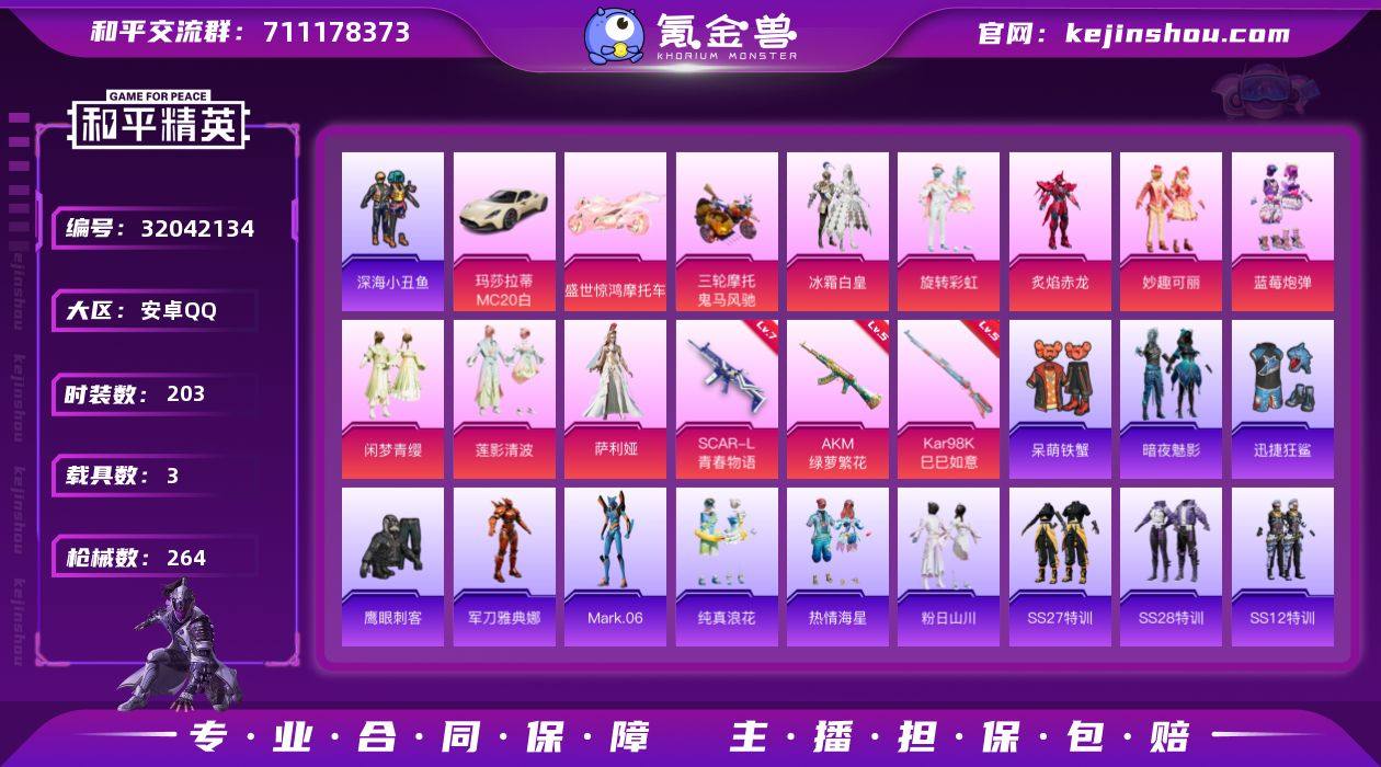 安卓 手Q-8粉装-3特效枪-3载具-84372热力值-14印记-203套装-264枪皮 【稀有载具】:玛莎拉蒂MC20(星石白),盛世惊鸿摩托车,鬼马风驰 【特效枪等级】:AKM-绿萝繁花(五级AKM-绿萝繁花),SCAR-L-青春物语(七级SCAR-L-青春物语),Kar98K-巳巳如意(五级Kar98K-巳巳如意) 【优质套装】:粉装-冰霜白皇,粉装-旋转彩虹,粉装-炙焰赤龙,粉装-妙趣可丽,粉装-蓝莓炮弹,粉装-闲梦青缨,粉装-莲影清波,角色-萨利娅 【稀有套装】:角色-Mark.06 【优质武器皮肤】:AKM-绿萝繁花,SCAR-L-青春物语,Vector-创世·救赎,Kar98K-梦幻火箭,Kar98K-巳巳如意 【稀有武器皮肤】:AKM-冰凉西瓜,AKM-夜灯,AKM-彩虹符号,AKM-灼热熔岩,AKM-破晓战魂,AKM-筑梦精灵,AKM-萌趣颜团子,AKM-虎虎生威,AKM-霓虹街区,AKM-龙的传人,M16A4-凝视深渊,M16A4-夜灯,M16A4-幻世战舞者,M16A4-甜心亚梦,M16A4-生命誓言,M16A4-红色方程式,SCAR-L-暗夜玫瑰,SCAR-L-炫彩节奏,SCAR-L-玉兔迎春,SCAR-L-王牌四分卫,SCAR-L-生命誓言,SCAR-L-红色方程式,SCAR-L-青丘仙客,M416-动感兔斯基,M416-暗星紫秘,M416-月影鸳鸯,M416-糯团青竹,M416-红色方程式,M416-蓝色火焰,GROZA-异彩先驱,GROZA-彩虹符号,GROZA-治愈之星,GROZA-生命誓言,GROZA-田园牧歌,GROZA-蓝莓炮弹,AUG-辉耀战甲,AUG-灵符少年,AUG-耀粉歌者,AUG-青春冒险家,QBZ-彩虹符号,QBZ-洛神天依,QBZ-神秘黑猫,QBZ-飞驰魅影,M762-天降萌叽,M762-彩虹甜喵,M762-牛气冲天,M762-瑞龙福将,M762-镭射皇者,Mk47-妙红点点,Mk47-洛神天依,Mk47-青春冒险家,G36C-时空追击者,AC-VAL-天降萌叽,AC-VAL-彩虹甜喵,AC-VAL-快闪甜心,AC-VAL-甜心亚梦,AC-VAL-闲梦青缨,蜜獾-垂柳戏鸭,蜜獾-天降萌叽,蜜獾-娇憨猪猪,UZI-啾咪啾咪,UZI-天降萌叽,UZI-娇憨猪猪,UZ...