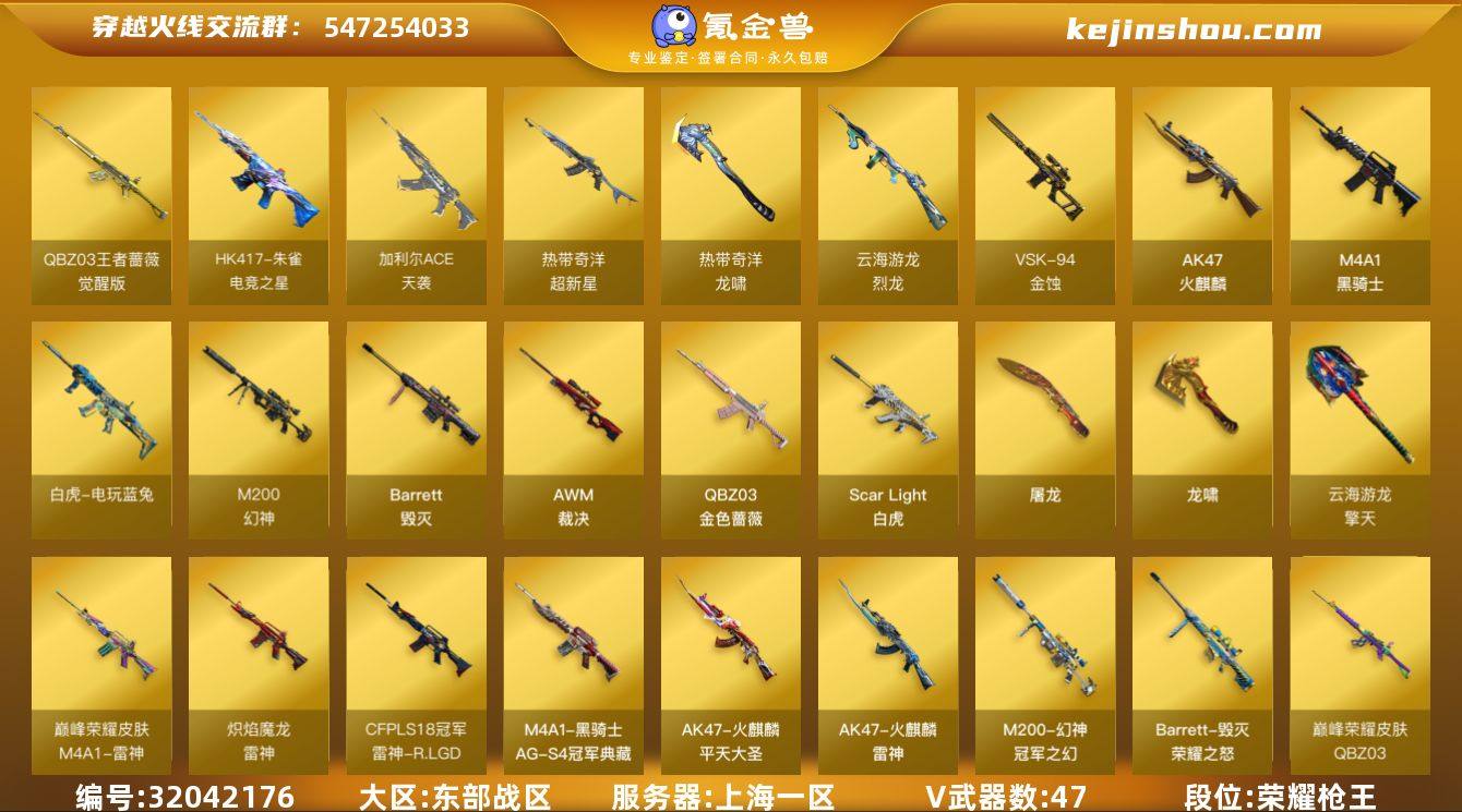【自带包赔 最高三倍】:东部战区:上海一区-LV100-高阶大元帅-荣耀传说-47V-4王者武器数-0炫金武器数 【热门武器】:QBZ03-金色蔷薇,Scar Light-白虎,M200-幻神,白虎-电玩蓝兔,M4A1-黑骑士,沙鹰-修罗*2,Knife-冠军之刃 【音效卡】:QBZ03-金色蔷薇音效卡,Scar Light-白虎音效卡,QBZ03-天罚音效卡 【皮肤】:幻神-冠军之幻,幻神-宠儿-2021MVP,白虎-电玩粉兔皮肤,QBZ03-巅峰荣耀皮肤,裁决-运输船 皮肤,雷神-R.LGD-CFPLS18冠军,雷神-炽焰魔龙,M4A1-雷神-巅峰荣耀皮肤,雷神-源计划2.0专属 皮肤,火麒麟-雷神,火麒麟-平天大圣,毁灭-荣耀之怒,黑骑士-AG-S4冠军典藏,修罗-能量核心,屠龙-星火燎原,麒麟刺-荣耀世冠白鲨 【角色】:影豹,机械姬,王者春(四防),奇洋探员,乔伊教练,修道士,云海玲珑,灵狐者-X,灵狐者-七夕宝贝,曼陀罗-X,潘多拉-X,潘多拉-甜心教官 【人偶武器】:星神-炽天使,迷你钢铁终结者,迷你救赎猎手,迷你波特博士,夺魂,深渊终结者手雷 【暴走生化】:超级对讲机 【挑战大师】:冰龙粉碎者-白马银枪*2,激光毁灭者III-白马银枪,阐释者III 【英雄级武器】:AK47-火麒麟,M4A1-雷神*2,M4A1-黑骑士,Scar Light-白虎,QBZ03-天罚,黑武士-锦绣游龙,超新星-热带奇洋,QBZ03-金色蔷薇,超新星-悦享-觉醒版,QBZ-03-王者蔷薇-觉醒版,白虎-电玩蓝兔,加利尔ACE-天袭,HK417-朱雀-电竞之星,Barrett-毁灭,AWM-裁决,M200-幻神,VSK-94-金蚀,烈龙-云海游龙,沙鹰-修罗*2,屠龙,龙啸,擎天-云海游龙,龙啸-热带奇洋,高爆手雷-幻灵*2,高爆手雷-云龙*2,手雷-云海游龙,手雷-热带奇洋,高爆手雷-雷霆王者-觉醒版,闪光弹-幻灵*2,闪光弹-云龙,闪光弹-雷霆王者-觉醒版,烟雾弹-幻灵*2,烟雾弹-云龙*2V-王者-炫金 道具、段位等以实际验号为准。如账号因没有...