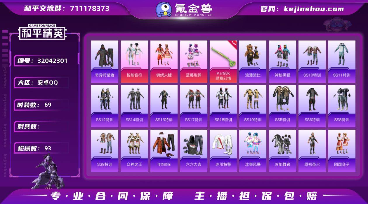 安卓 手Q-3粉装-1特效枪-0载具-27311热力值-2印记-69套装-93枪皮 【特效枪等级】:Kar98K-绿意幻情(一级Kar98K-绿意幻情) 【优质套装】:粉装-智能音符,粉装-锦绣火鲤,粉装-蓝莓炮弹 【优质武器皮肤】:Kar98K-绿意幻情 【稀有武器皮肤】:AKM-破晓战魂,AKM-萌趣颜团子,AKM-虎虎生威,AKM-锦绣火鲤,M16A4-机械英豪,M16A4-红色方程式,M16A4-蓝色火焰,SCAR-L-炫彩节奏,SCAR-L-红色方程式,M416-夜灯,M416-神秘黑猫,M416-红色方程式,M416-蓝色火焰,M416-魔法学院,GROZA-治愈之星,GROZA-蓝莓炮弹,AUG-耀粉歌者,QBZ-原初圣火,QBZ-彩虹符号,QBZ-神秘黑猫,M762-奇异狩猎者,M762-拳皇97,M762-牛气冲天,M762-瑞龙福将,Mk47-洛神天依,G36C-不夜海上花,UZI-众神之王,UZI-炫彩节奏,UZI-红色方程式,UZI-金风玉露,UMP45-生命誓言,UMP45-蓝色火焰,汤姆逊-奇异狩猎者,汤姆逊-耀粉歌者,野牛-机械英豪,MP5K-众神之王,MP5K-蓝莓炮弹,Kar98K-幻影战神,Kar98K-彩虹符号,Kar98K-红色方程式,M24-众神之王,M24-奇异狩猎者,AWM-不夜海上花,SKS-夜灯,SKS-折纸暴龙,Mini14-原初圣火,Mini14-春暖花开,Mini14-炫彩节奏,Mini14-耀粉歌者,Win94-机械英豪,Win94-瑞龙福将,SLR-众神之王,SLR-四圣焕新,QBU-不夜海上花,S686-不夜海上花,S1897-春暖花开,S1897-神秘黑猫,S12K-瑞龙福将,S12K-PEL轰鸣竞梦者,S12K-机械英豪,M249-破晓战魂,DP-28-原初圣火,MG3-瑞龙福将,MG3-甜心娃娃,P92-拳皇97,P18C-原初圣火 【热门品类】:套装-奇异狩猎者 【其他套装】:套装-SS10特训,套装-SS11特训,套装-SS12特训,套装-SS14特训,套装-SS15特训,套装-SS17特训,套装-SS18特训,套装-SS19特训,套装-SS5特训,套装-SS6特训,套装-SS8特训,套装-SS9特训,套装-众神之王,套装-传奇侦探,套装-六...