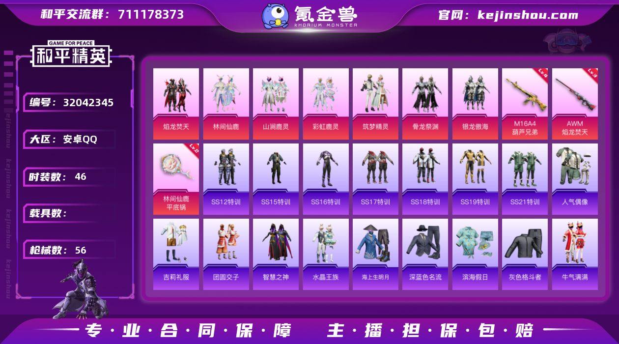 安卓 手Q-7粉装-3特效枪-0载具-20505热力值-0印记-46套装-56枪皮 【特效枪等级】:M16A4-葫芦兄弟(四级M16A4-葫芦兄弟),AWM-焰龙焚天(三级AWM-焰龙焚天),平底锅-林间仙鹿(二级平底锅-林间仙鹿) 【优质套装】:粉装-焰龙焚天,粉装-林间仙鹿,粉装-山涧鹿灵,粉装-彩虹鹿灵,粉装-筑梦精灵,粉装-骨龙祭渊,粉装-银龙傲海 【优质武器皮肤】:M16A4-葫芦兄弟,AWM-焰龙焚天,平底锅-林间仙鹿 【稀有武器皮肤】:AKM-彩虹符号,AKM-萌趣颜团子,AKM-虎虎生威,M16A4-幻世战舞者,SCAR-L-炫彩节奏,SCAR-L-红色方程式,M416-夜灯,M416-葫芦兄弟,GROZA-林间仙鹿,AUG-焰龙焚天,QBZ-彩虹符号,M762-瑞龙福将,Mk47-林间仙鹿,AC-VAL-天降萌叽,UZI-炫彩节奏,UMP45-蓝色火焰,Vector-彩虹符号,汤姆逊-天降萌叽,汤姆逊-林间仙鹿,MP5K-焰龙焚天,P90-筑梦精灵,Kar98K-炫彩节奏,Kar98K-红色方程式,M24-炫彩节奏,M24-冰封烈焰,SKS-夜灯,Mini14-林间仙鹿,Mini14-涂山之恋,Mini14-耀粉歌者,Win94-瑞龙福将,SLR-葫芦兄弟,S686-生命誓言,S686-葫芦兄弟,S12K-瑞龙福将,M249-焰龙焚天,DP-28-清新柠檬,MG3-瑞龙福将,蝎式手枪-焰龙焚天 【其他套装】:套装-SS12特训,套装-SS15特训,套装-SS16特训,套装-SS17特训,套装-SS18特训,套装-SS19特训,套装-SS21特训,套装-人气偶像,套装-吉莉礼服,套装-团圆交子,套装-智慧之神,套装-水晶王族,套装-海上生明月,套装-深蓝色名流,套装-滨海假日,套装-灰色格斗者,套装-牛气满满,套装-特种颜团子,套装-猎鹰,套装-瑞龙福将,套装-破晓战魂,套装-破蛋小黄鸡,套装-福星高照,套装-竞技名士,套装-耀粉歌者,套装-萌趣颜团子,套装-虎虎生威吉莉,套装-蝎王蛇后,套装-街头潮人,套装-长空猛禽,套装-雨林探路者,套装-青年教官,套装-骑行爱好者,套装-...